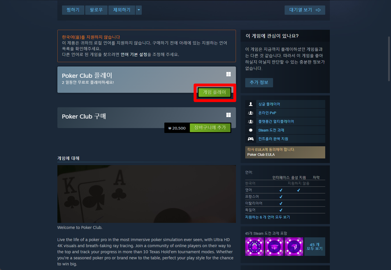 "Poker Club" 게임페이지를 조금 내려서 [게임 플레이] 버튼을 클릭하면 됩니다.