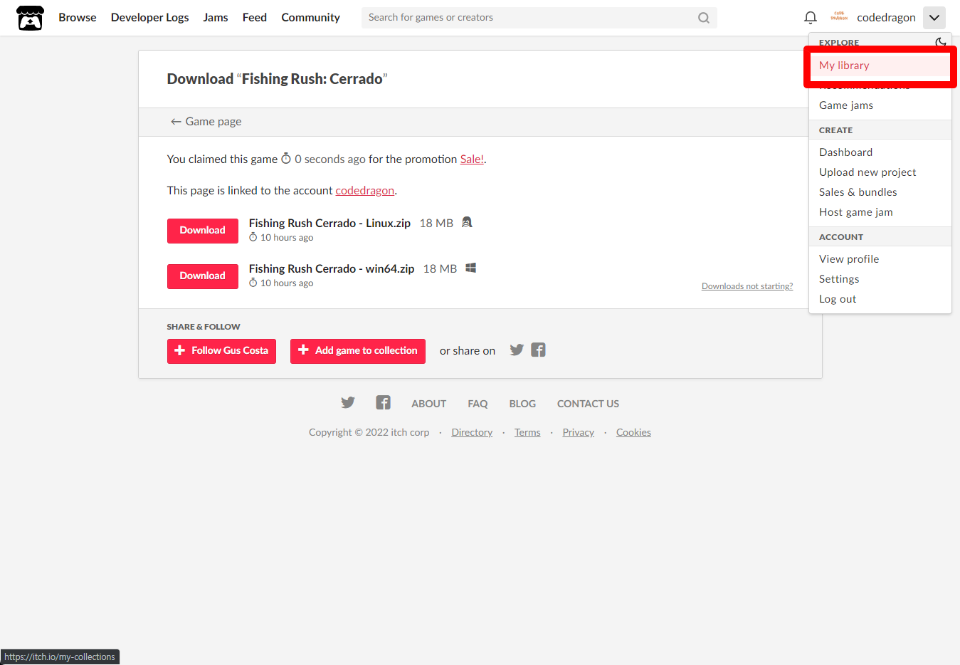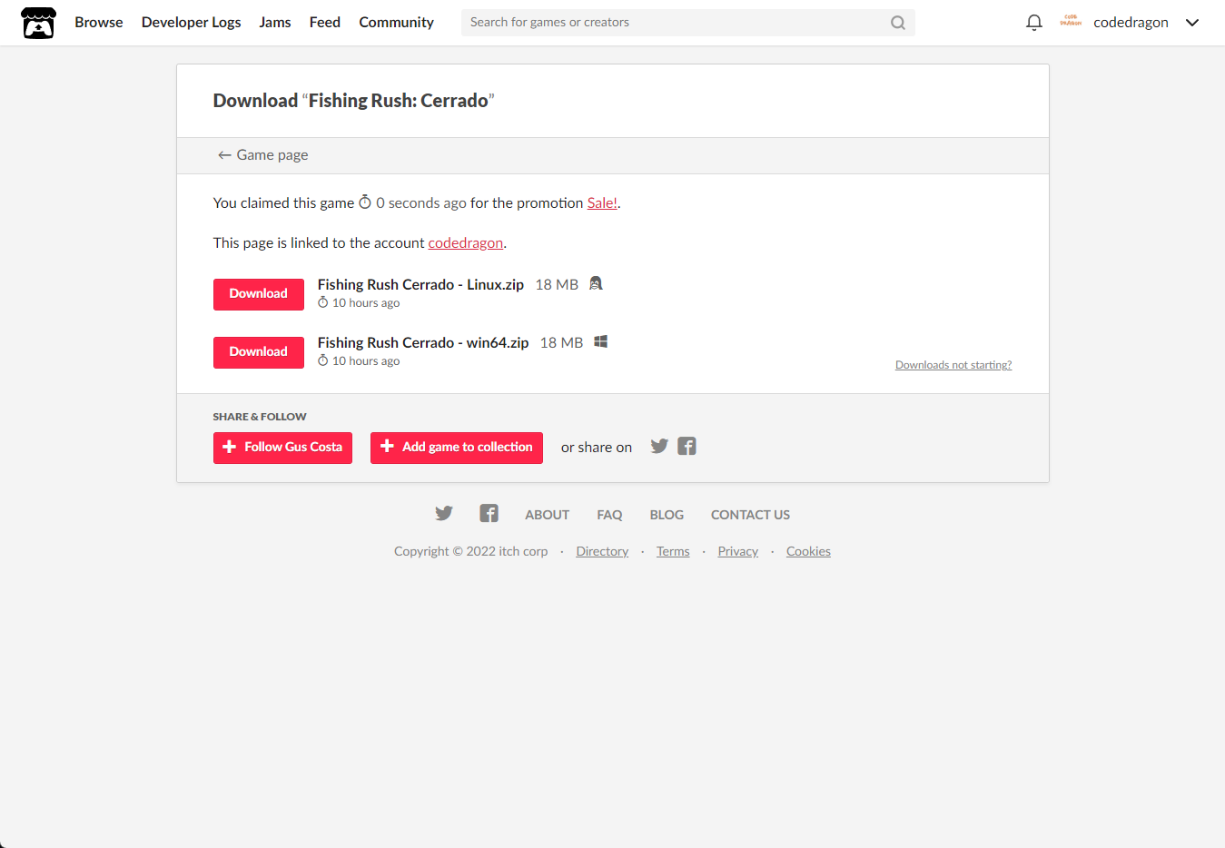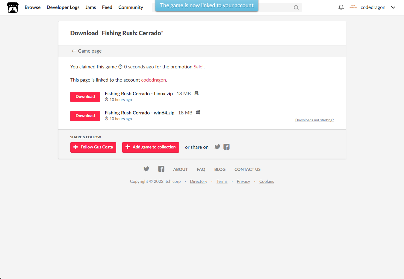 [Claim game]을 클릭하면 "Fishing Rush: Cerrado" 게임이 나의 게임 라이브러리에 추가되고 설치파일을 다운받을 수 있는 페이지로 이동됩니다.