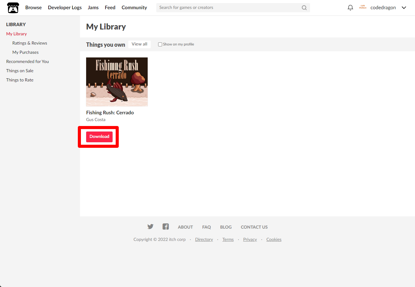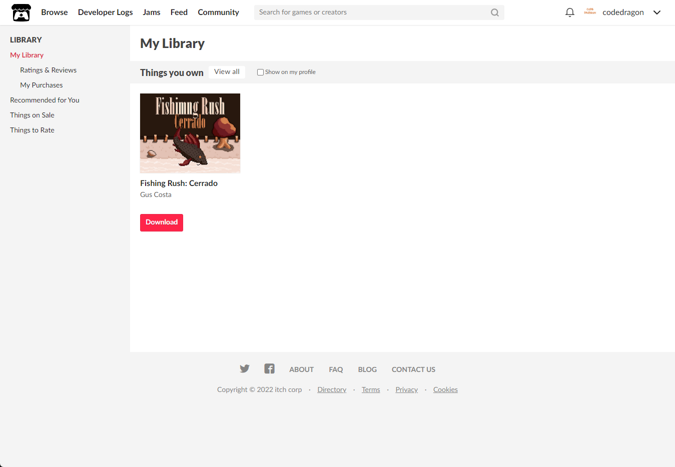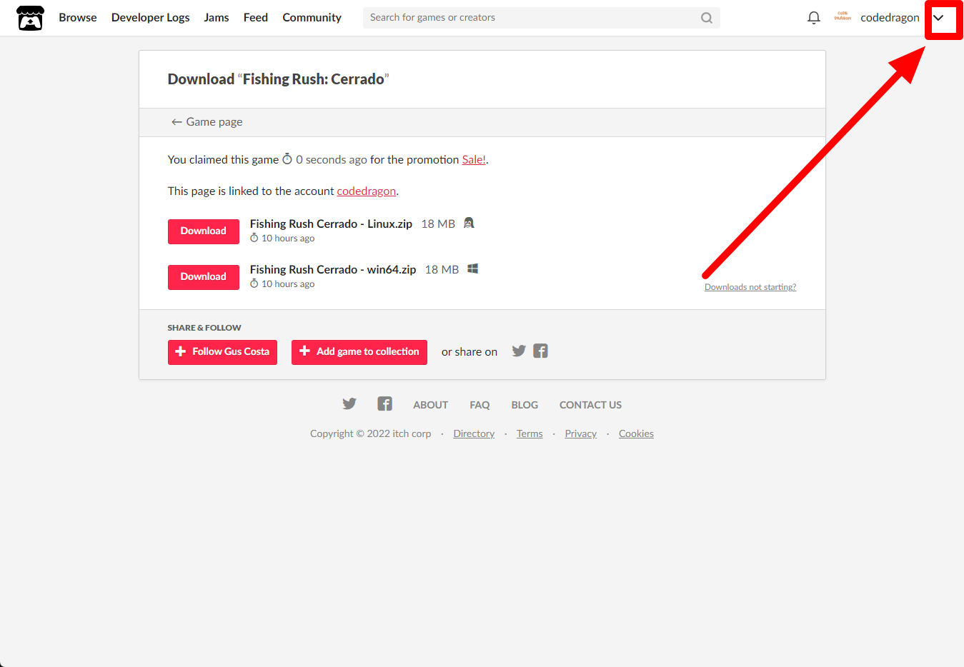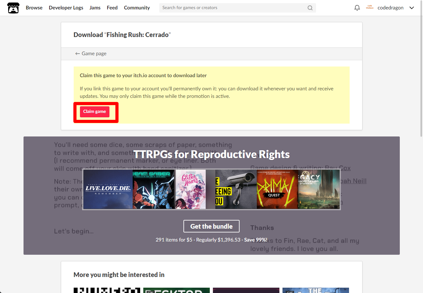 [Claim game]을 클릭하면 "Fishing Rush: Cerrado" 게임이 나의 게임 라이브러리에 추가되고 설치파일을 다운받을 수 있는 페이지로 이동됩니다.