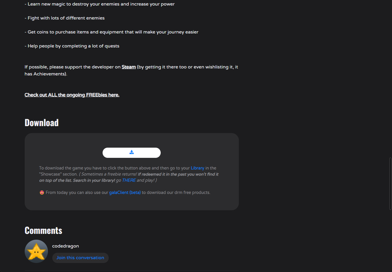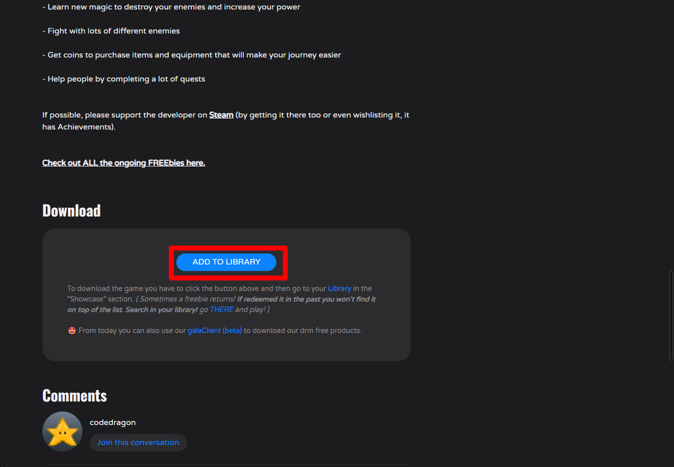 "Dangerous Lands - Magic and RPG" 게임 페이지를 내려 [ADD TO LIBRARY]를 클릭합니다.