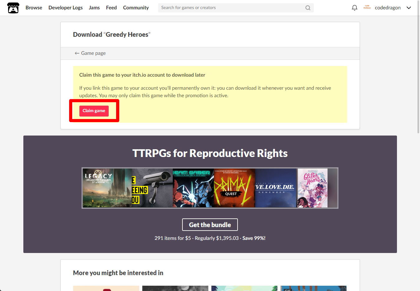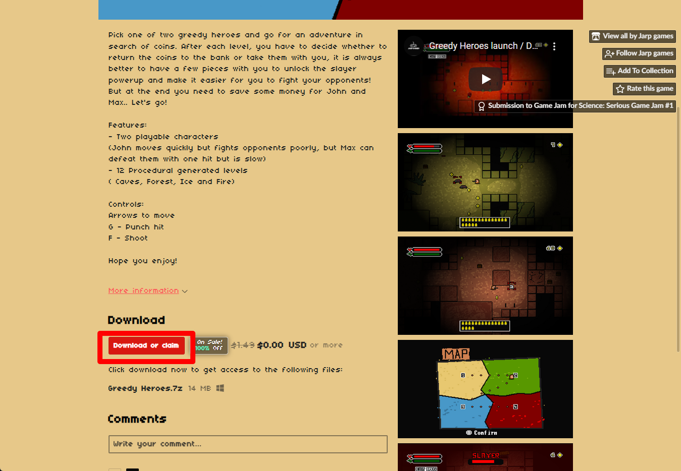 "Greedy Heroes" 페이지를 내려서 [Download or claim]을 클릭합니다.