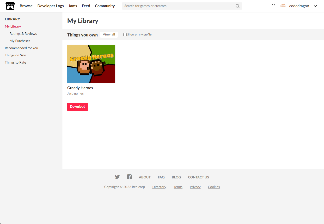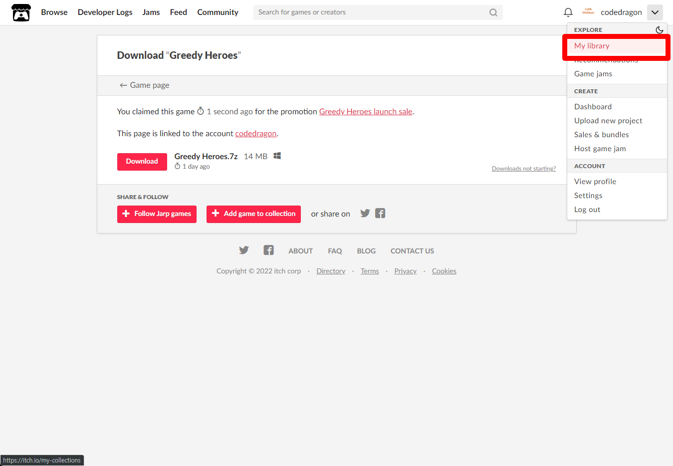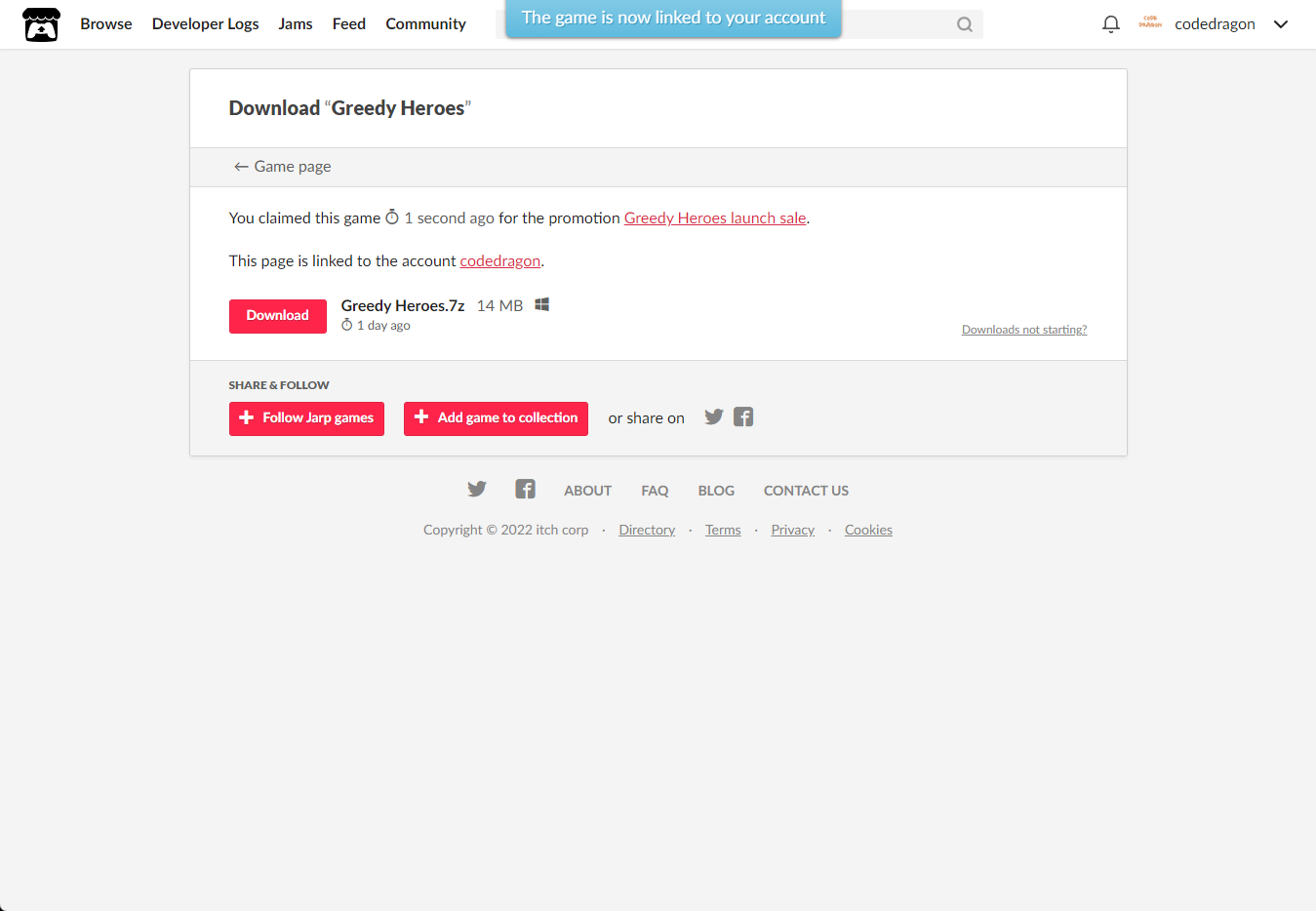 [Claim game]을 클릭하면 "Greedy Heroes" 게임이 나의 게임 라이브러리에 추가되고 설치파일을 다운받을 수 있는 페이지로 이동됩니다.