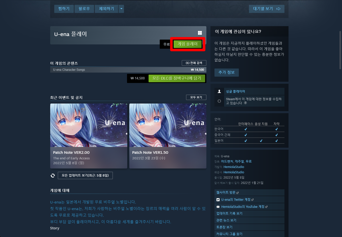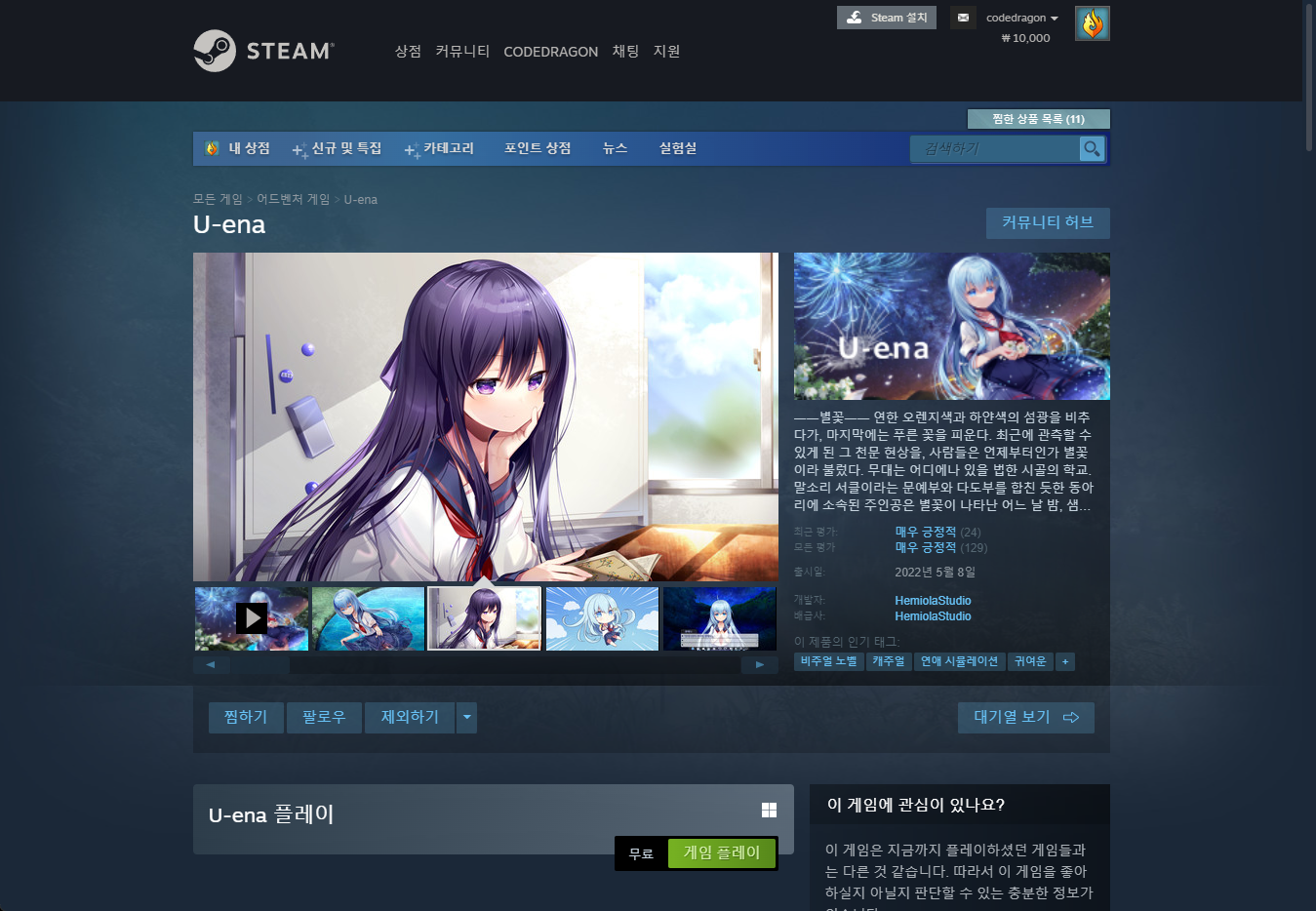 "U-ena" 스팀 페이지 입니다.