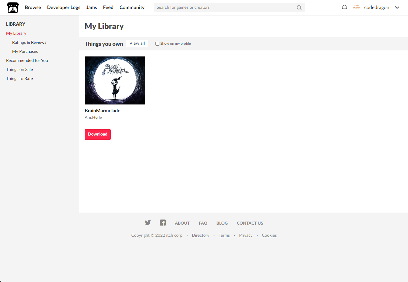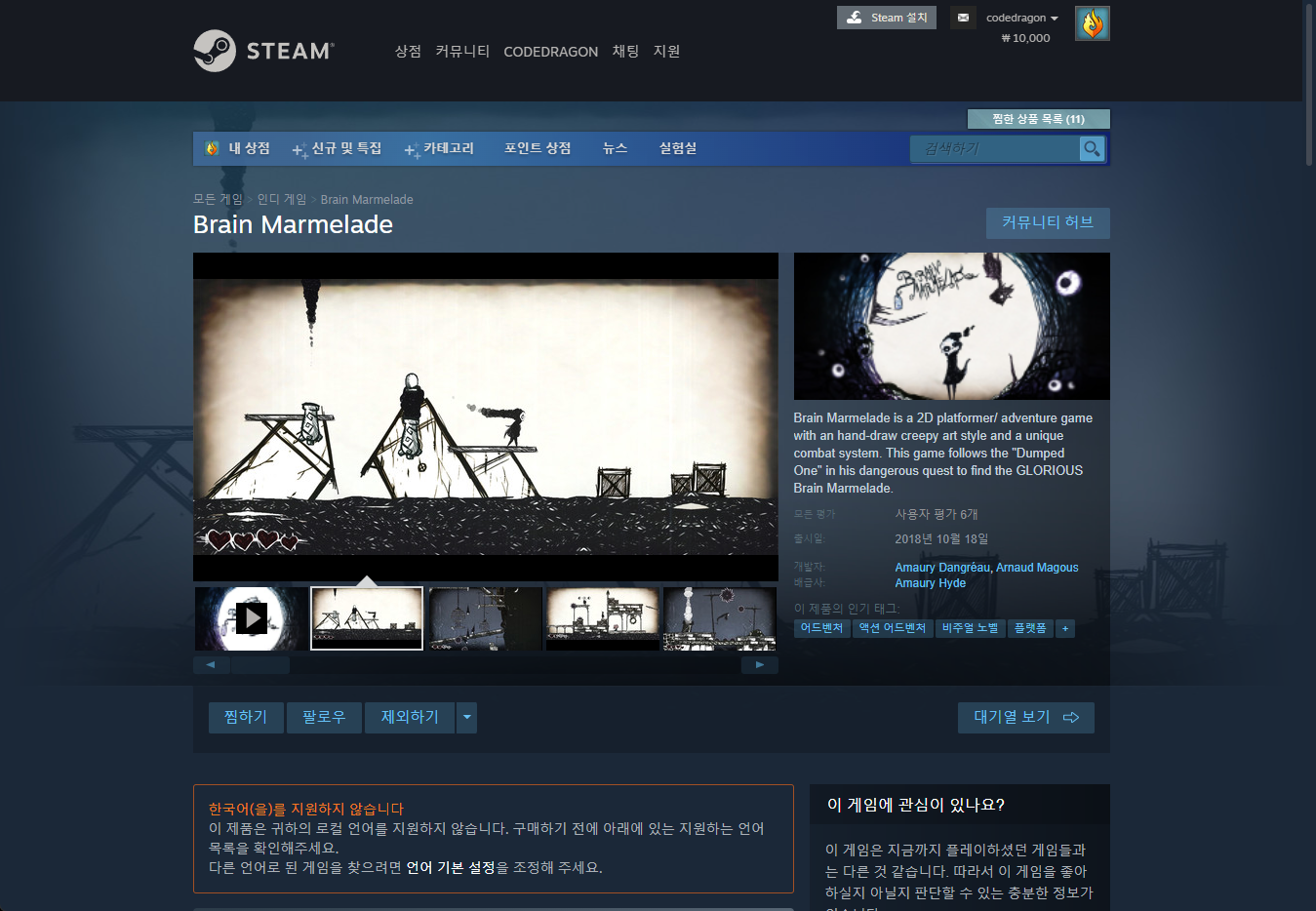 [Claim game]을 클릭하면 "Brain Marmelade" 게임이 나의 게임 라이브러리에 추가되고 설치파일을 다운받을 수 있는 페이지로 이동됩니다.