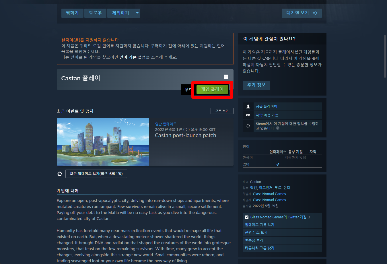 "Castan" 페이지를 내려 [게임 플레이]를 클릭하면 됩니다.