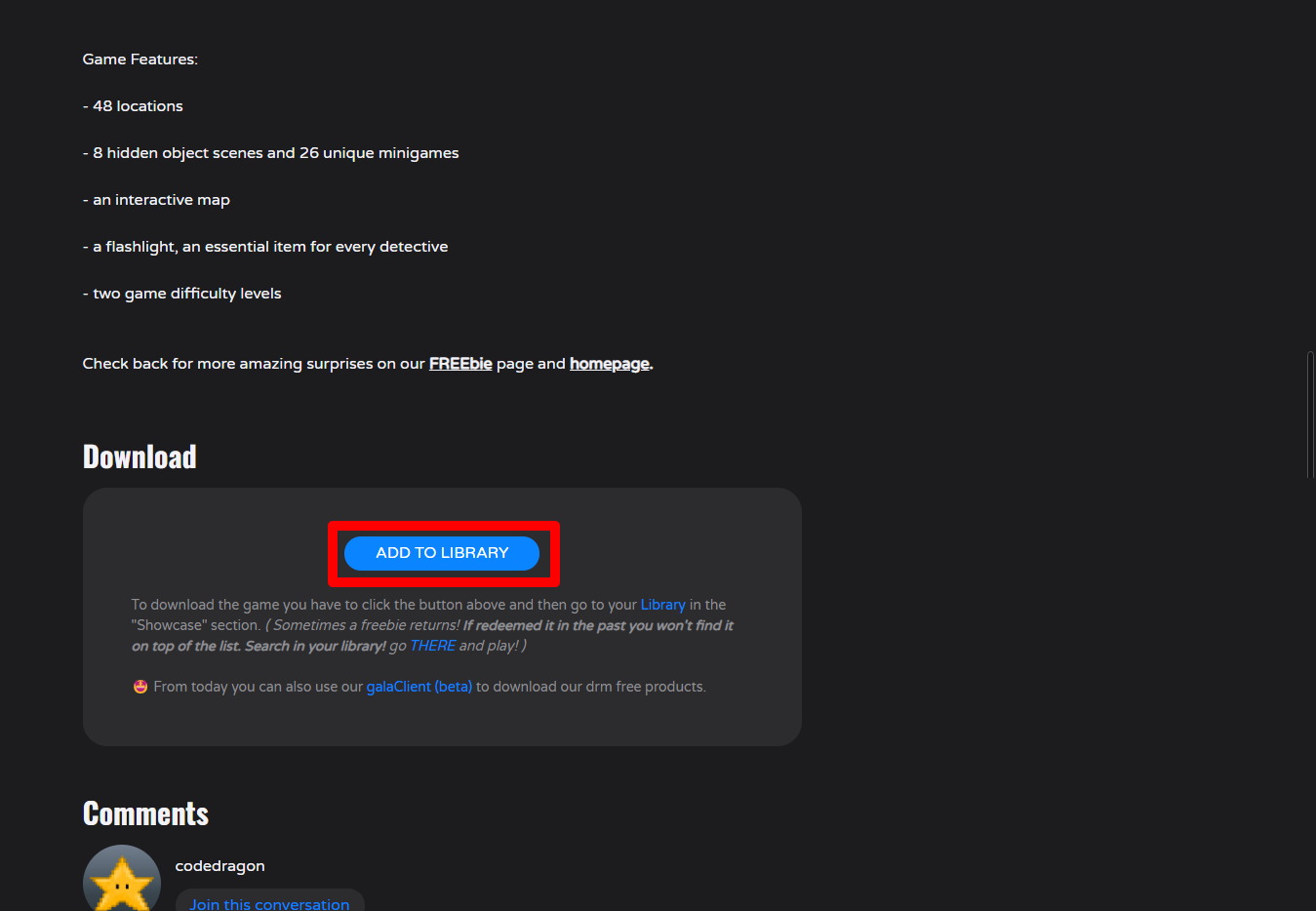 "Hope Lake" 게임 페이지를 내려 [ADD TO LIBRARY]를 클릭합니다.
