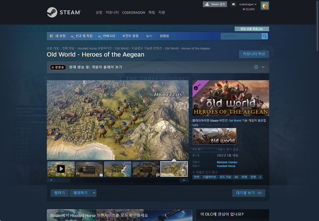 "Old World - Heroes of the Aegean" DLC를 받기 위해서는 기본게임인 "Old World" 가지고 있거나 구매(₩39,000)해야 합니다.