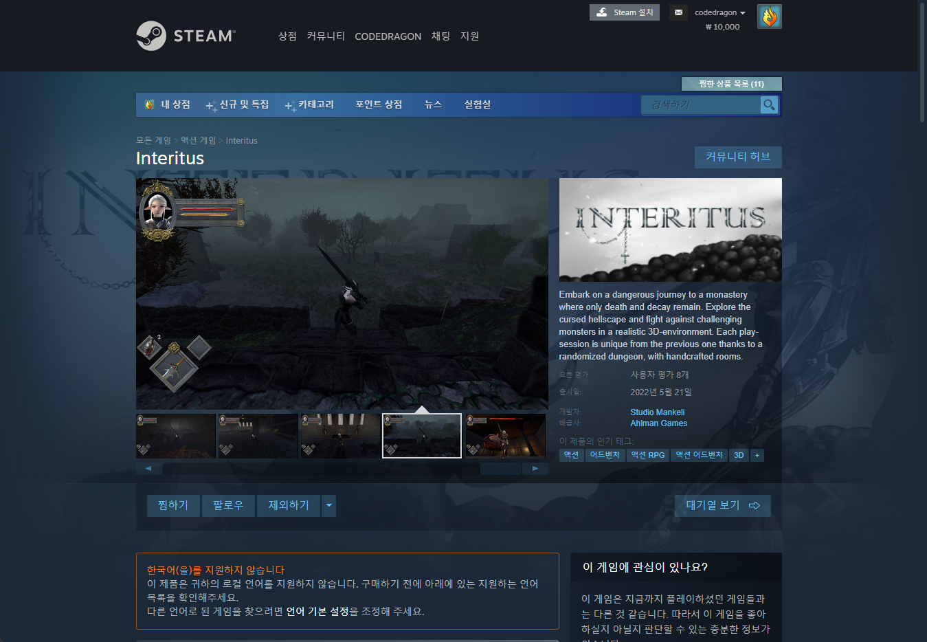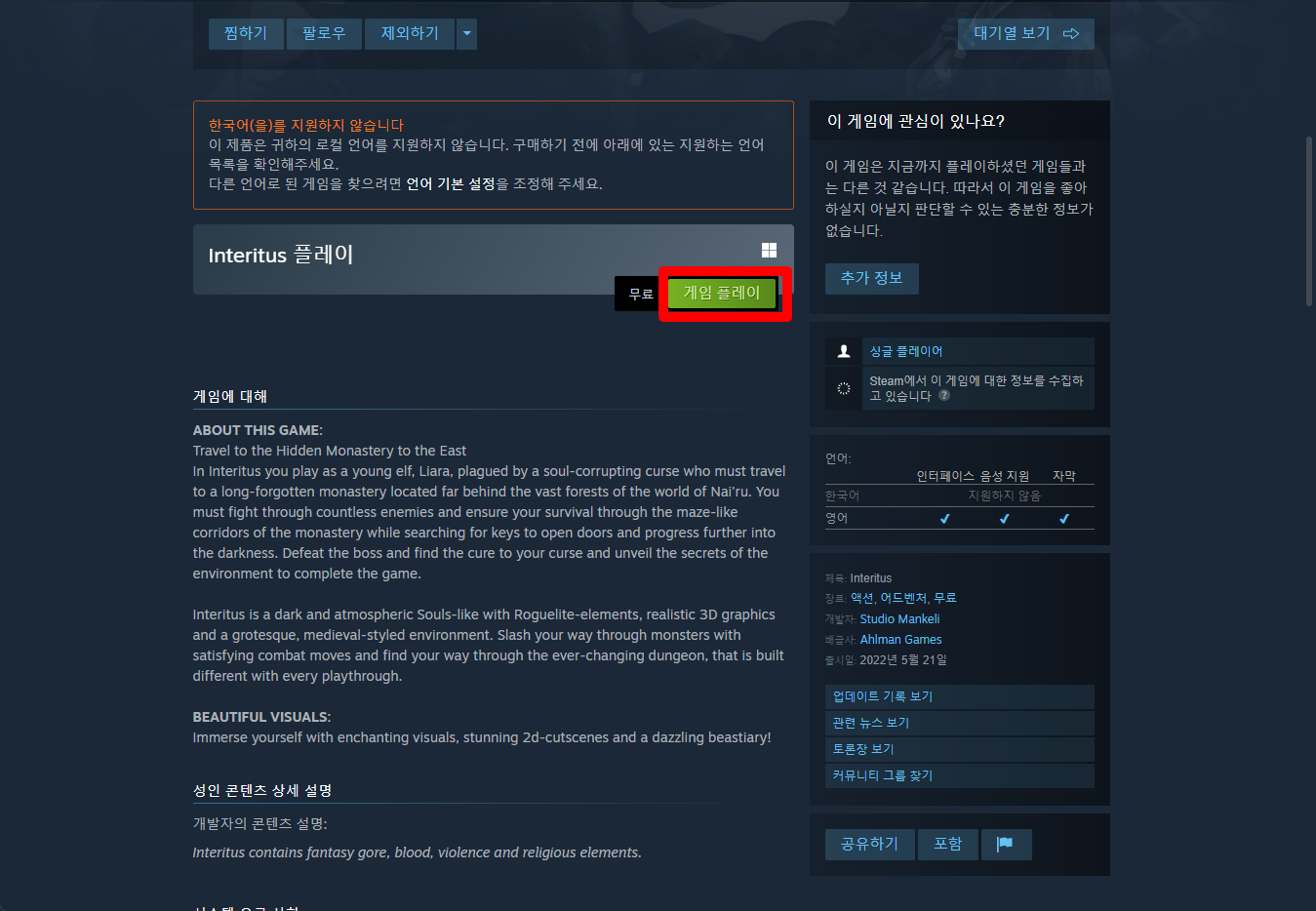 "Interitus" 페이지를 내려 [게임 플레이]를 클릭하면 됩니다.