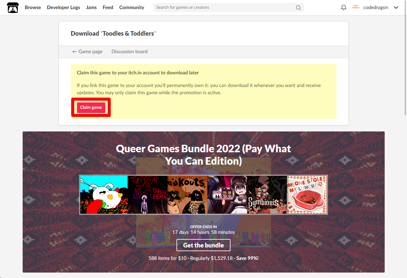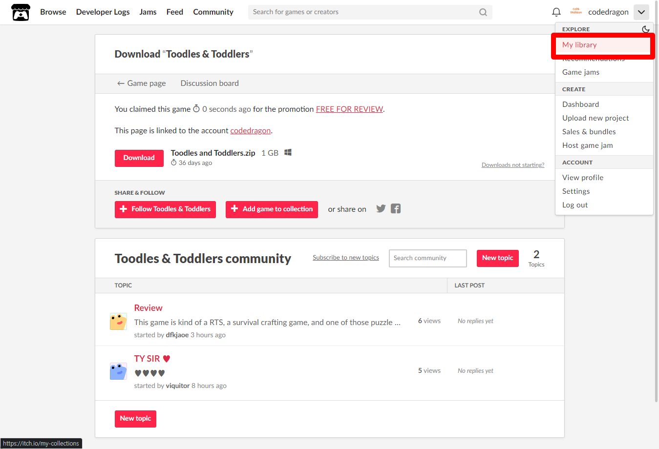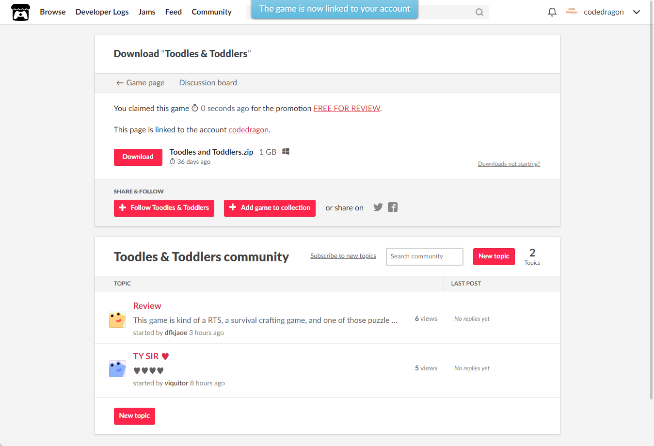 [Claim game]을 클릭하면 "Toodles & Toddlers" 게임이 나의 게임 라이브러리에 추가되고 설치파일을 다운받을 수 있는 페이지로 이동됩니다.