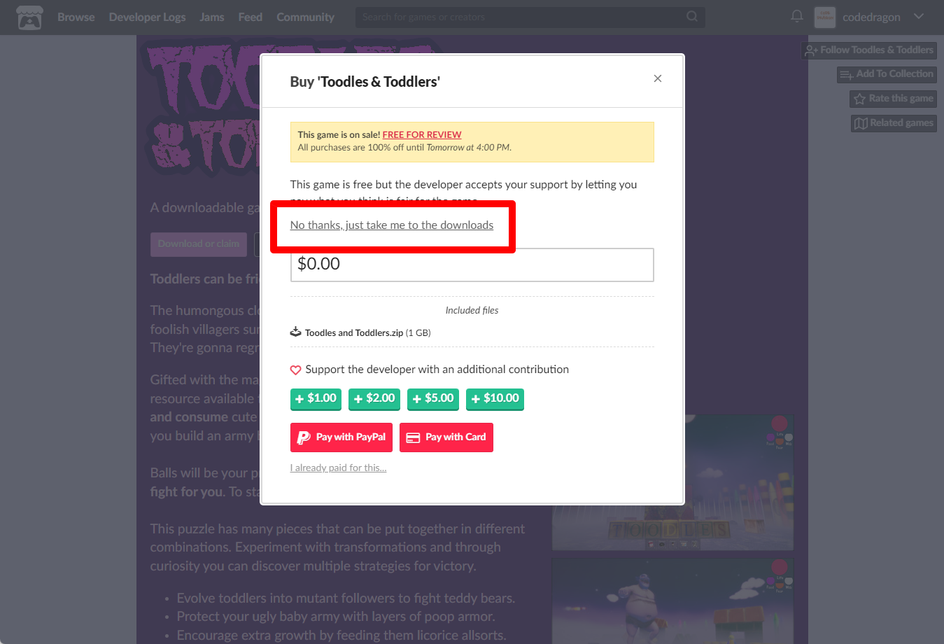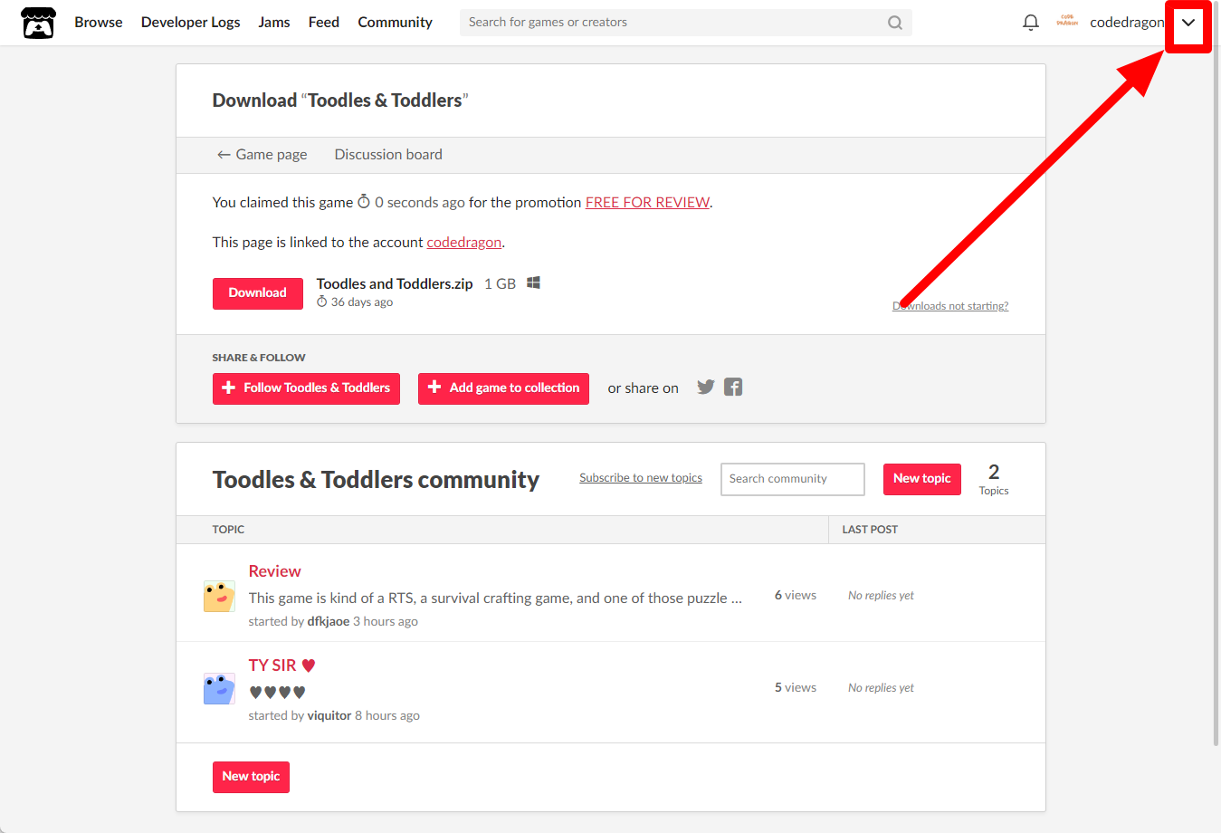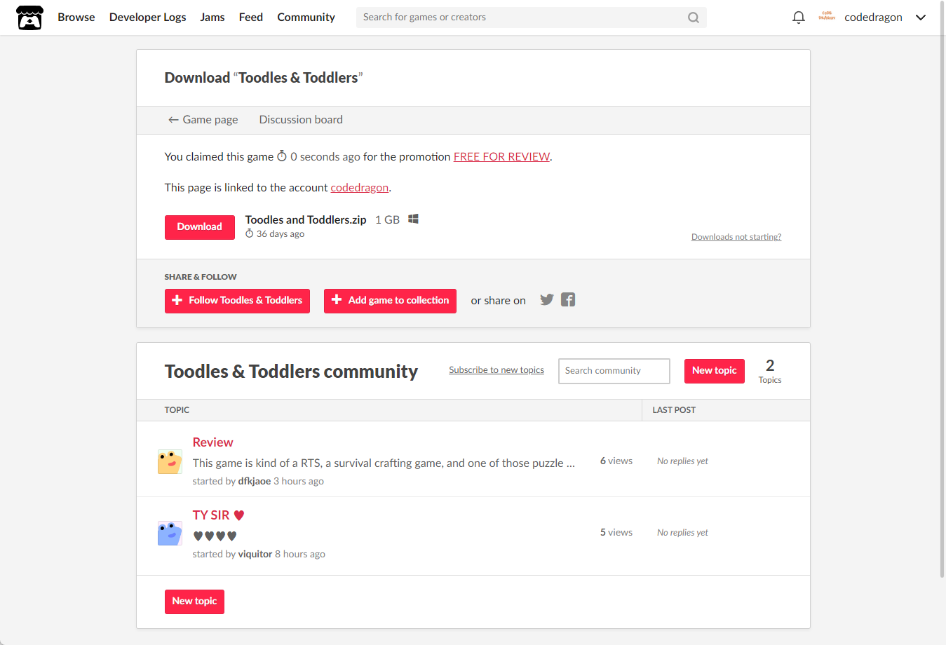[Claim game]을 클릭하면 "Toodles & Toddlers" 게임이 나의 게임 라이브러리에 추가되고 설치파일을 다운받을 수 있는 페이지로 이동됩니다.