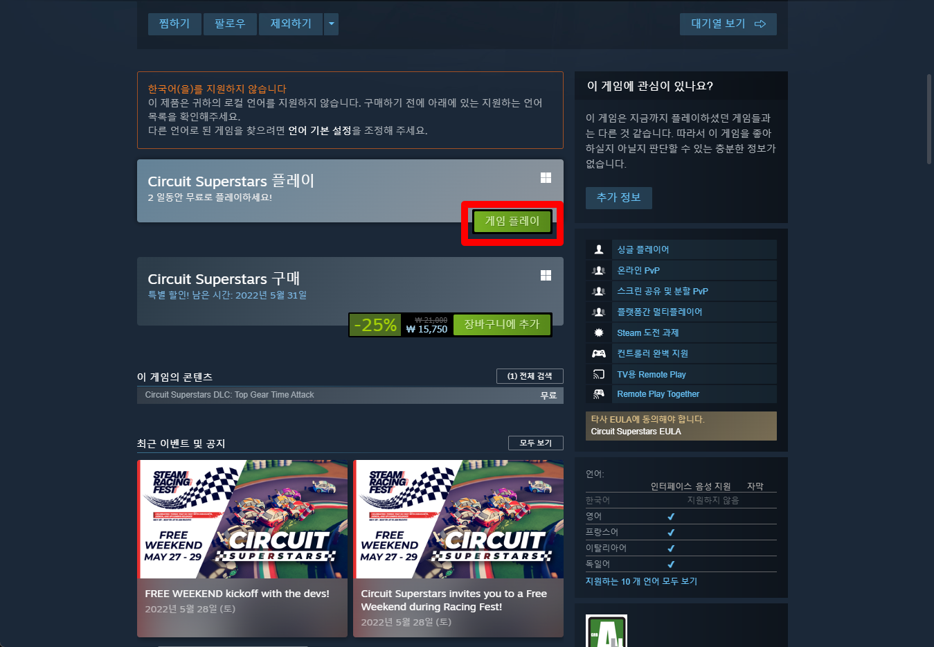 "Circuit Superstars" 게임페이지를 조금 내려서 [게임 플레이] 버튼을 클릭하면 됩니다.