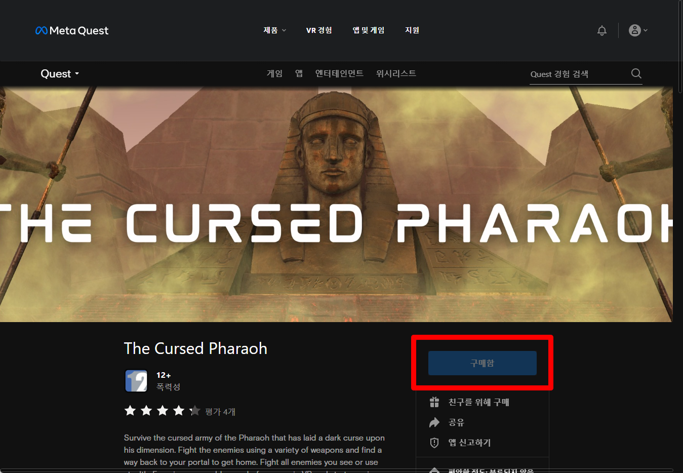 "The Cursed Pharaoh" 게임 페이지를 보면 "구매함"으로 표시되어 있어 가지고 있는 것 확인할 수 있습니다.