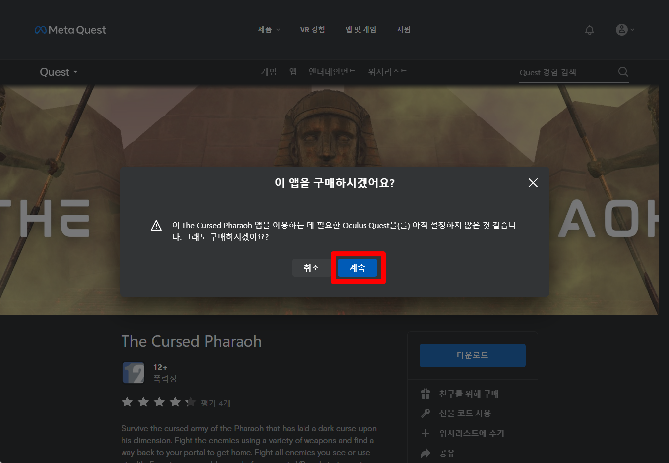 "The Cursed Pharaoh" 구매확인창이 나오면 [계속] 클릭합니다.