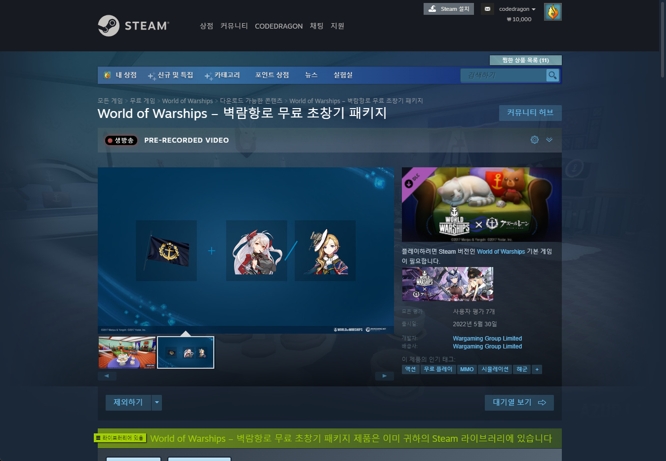 "World of Warships × Azur Lane: Free Intro Bundle" 게임 보유 확인