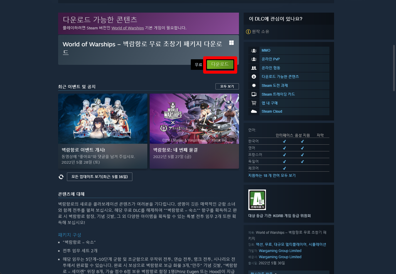 "World of Warships × Azur Lane: Free Intro Bundle" 해당 DLC를 받기 위해서는 베이스게임(World of Warships)을 보유하고 있어야 합니다.