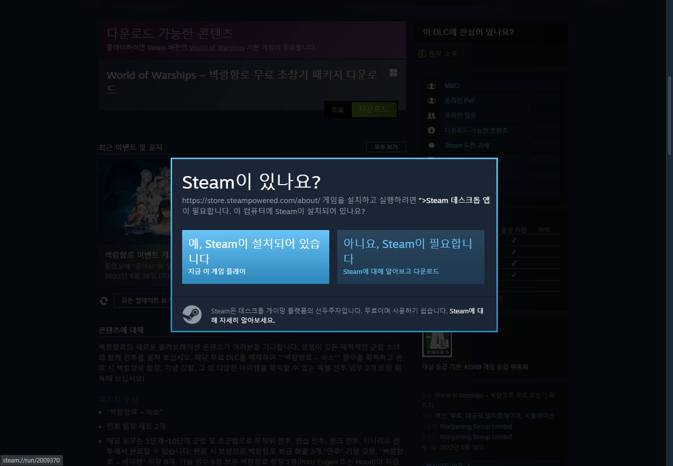 "World of Warships × Azur Lane: Free Intro Bundle" 게임페이지를 조금 내려준 후 [계정에 추가] 버튼을 클릭한 후 스팀런처 실행하면 게임라이브러리에 추가됩니다.