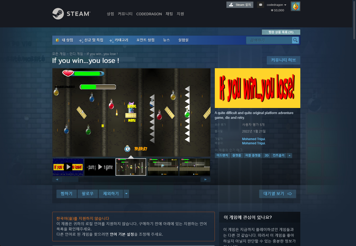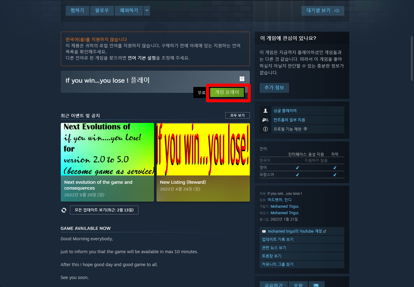 "If you win...you lose !" 스팀 페이지 입니다.