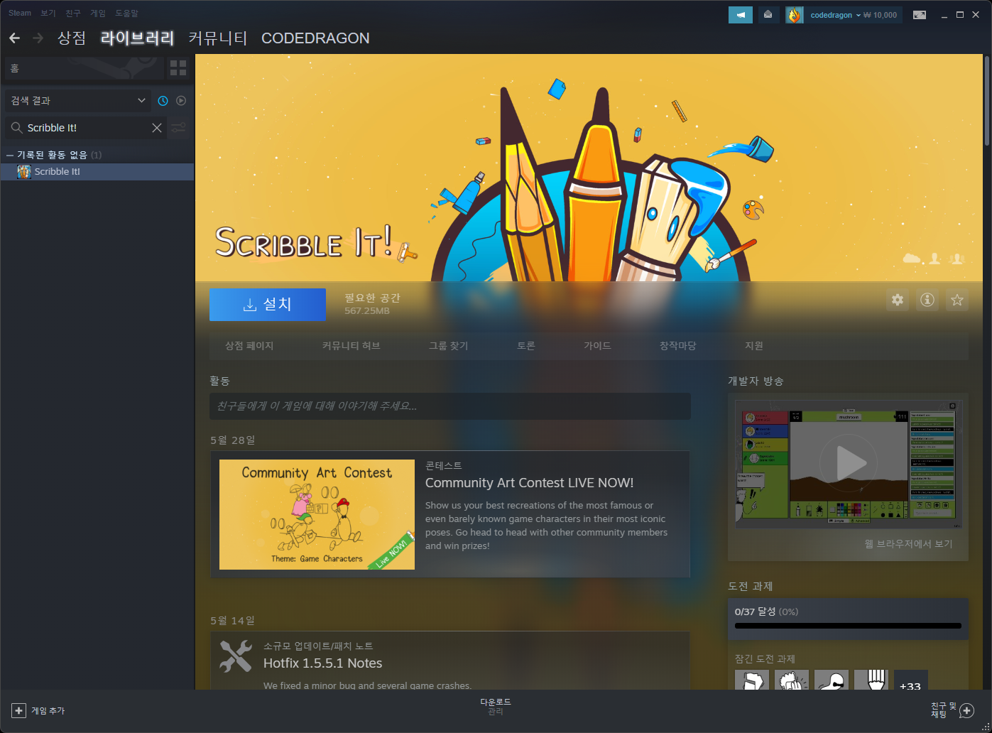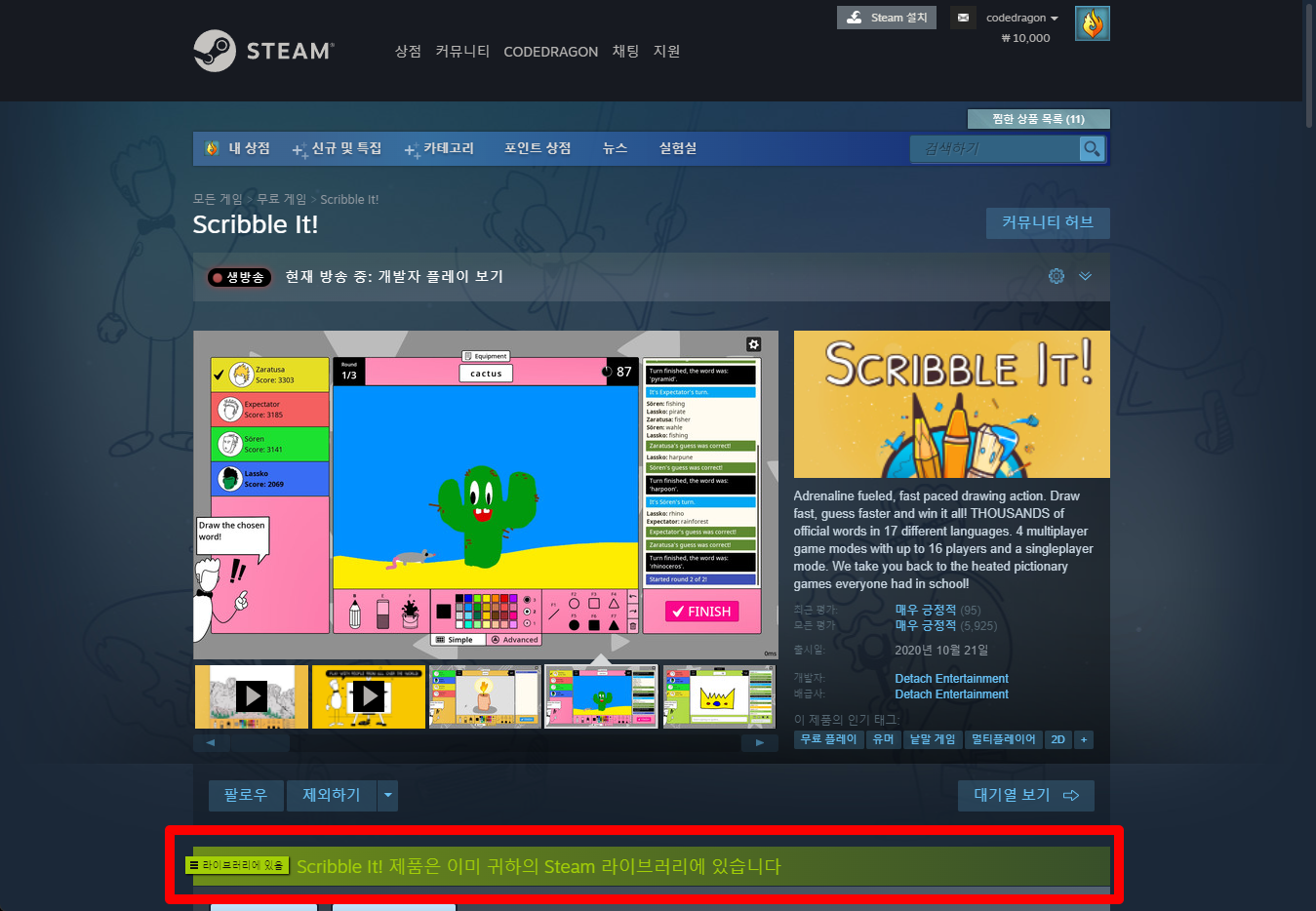 "Scribble It!" 게임페이지 녹색으로 "라이브러리에 있음" 으로 표시되어 게임을 가지고 있는 것 확인할 수 있습니다.