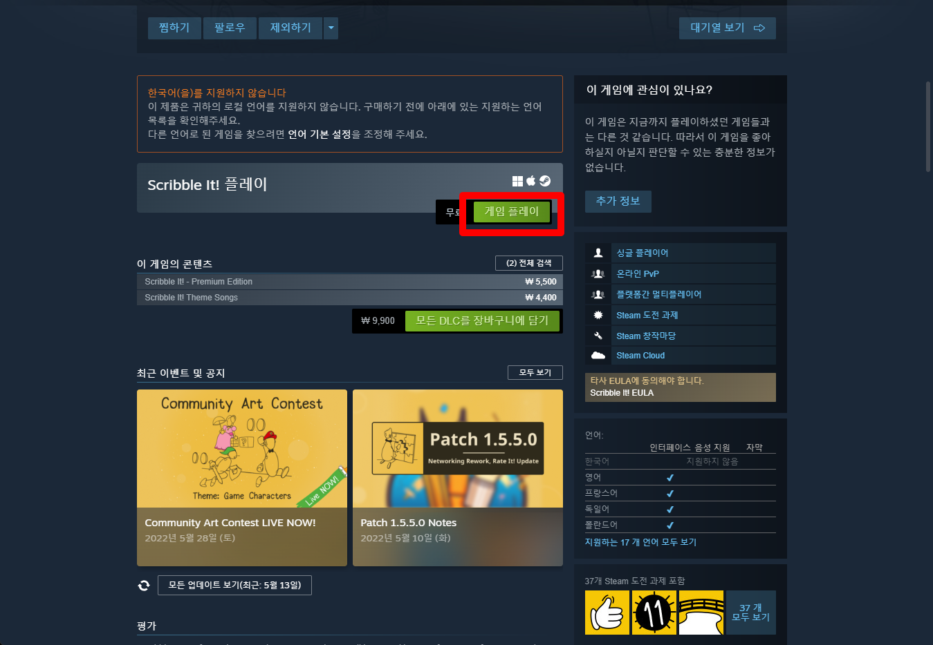 "Scribble It!" 페이지를 내려 [게임 플레이]를 클릭하면 됩니다.