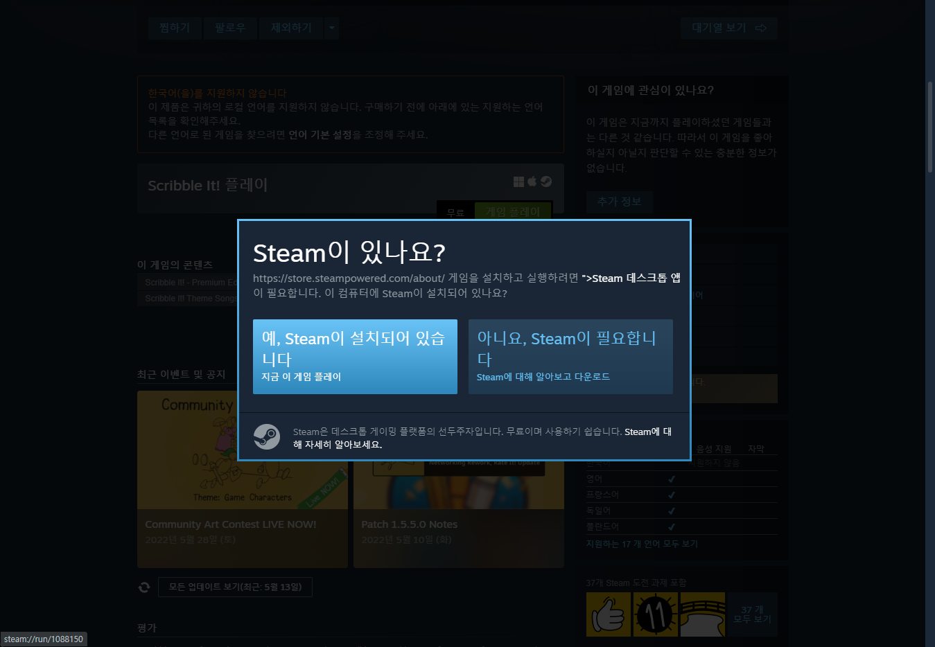 Steam 런처가 실행되면 원하는 위치에 "Scribble It!" 게임 설치를 완료해 줍니다.