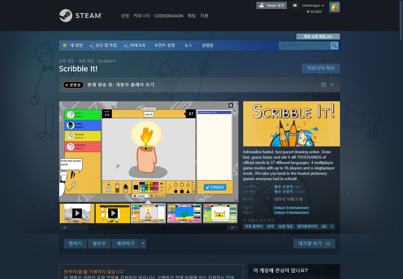 "Scribble It!" 게임페이지 녹색으로 "라이브러리에 있음" 으로 표시되어 게임을 가지고 있는 것 확인할 수 있습니다.