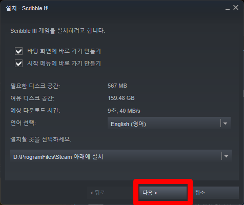 Steam 런처가 실행되면 원하는 위치에 "Scribble It!" 게임 설치를 완료해 줍니다.