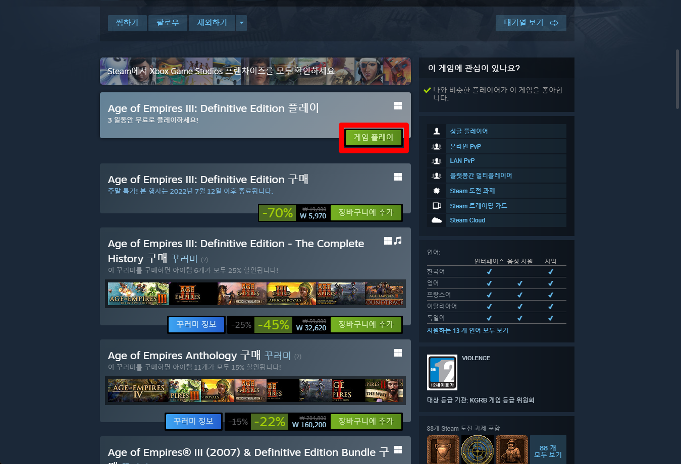 "Age of Empires III: Definitive Edition" 게임페이지를 조금 내려서 [게임 플레이] 버튼을 클릭하면 됩니다.