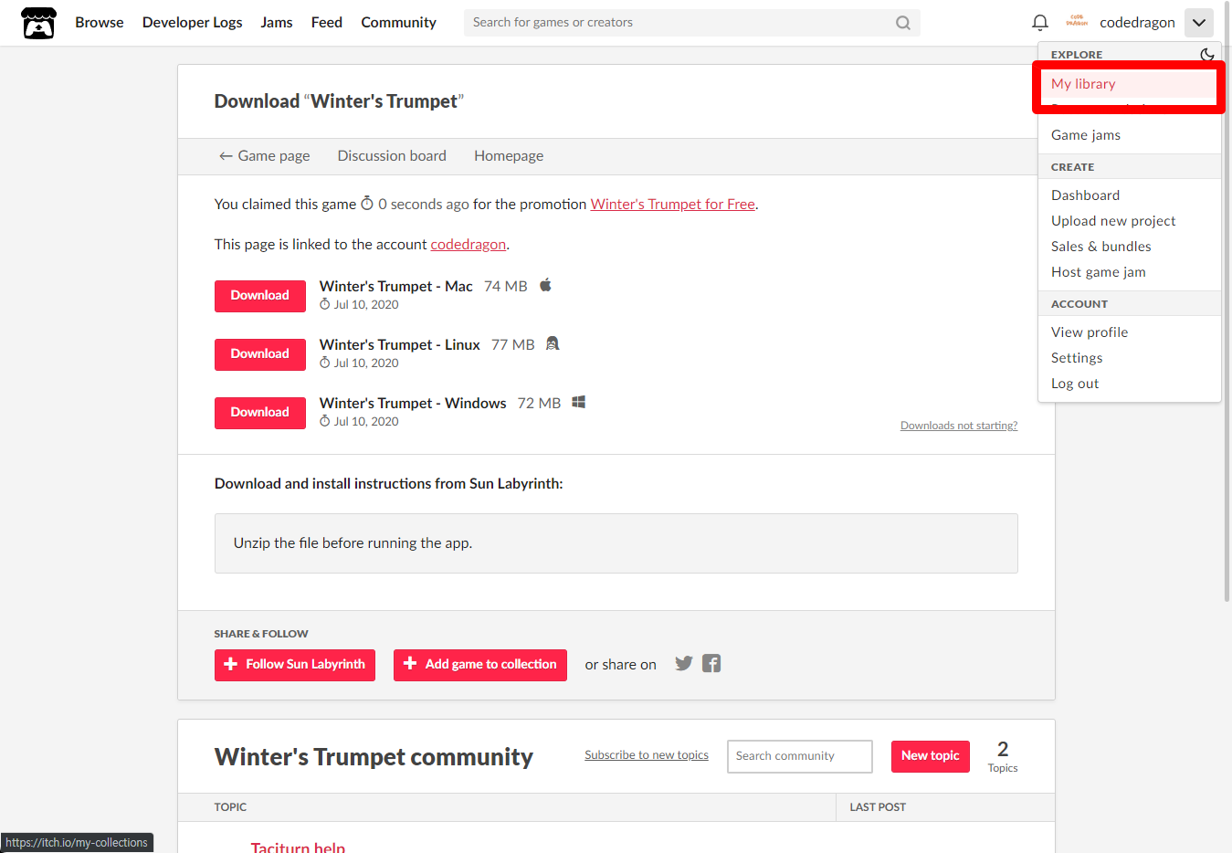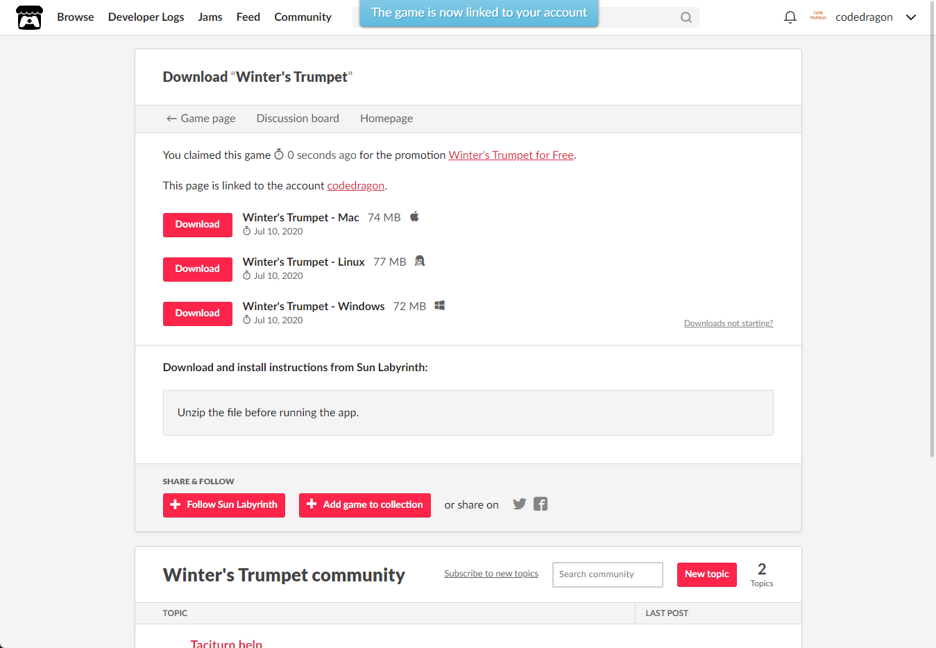 [Claim game]을 클릭하면 "Winter's Trumpet" 게임이 나의 게임 라이브러리에 추가되고 설치파일을 다운받을 수 있는 페이지로 이동됩니다.