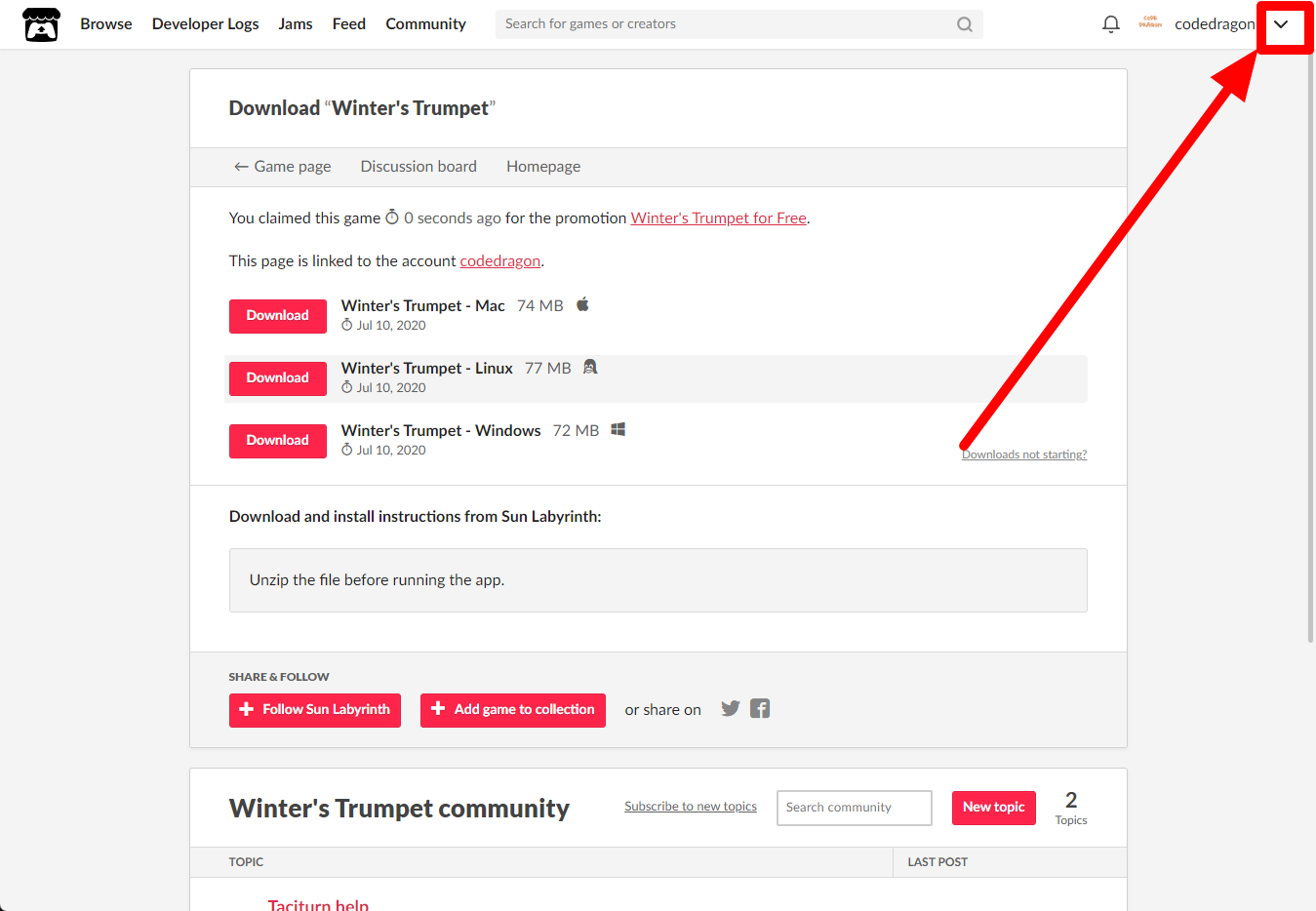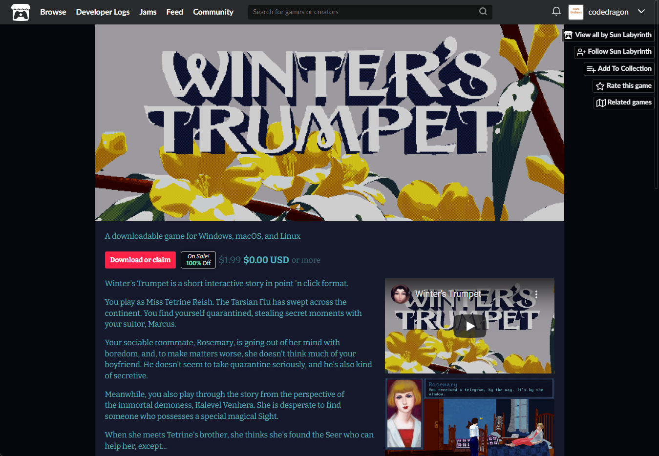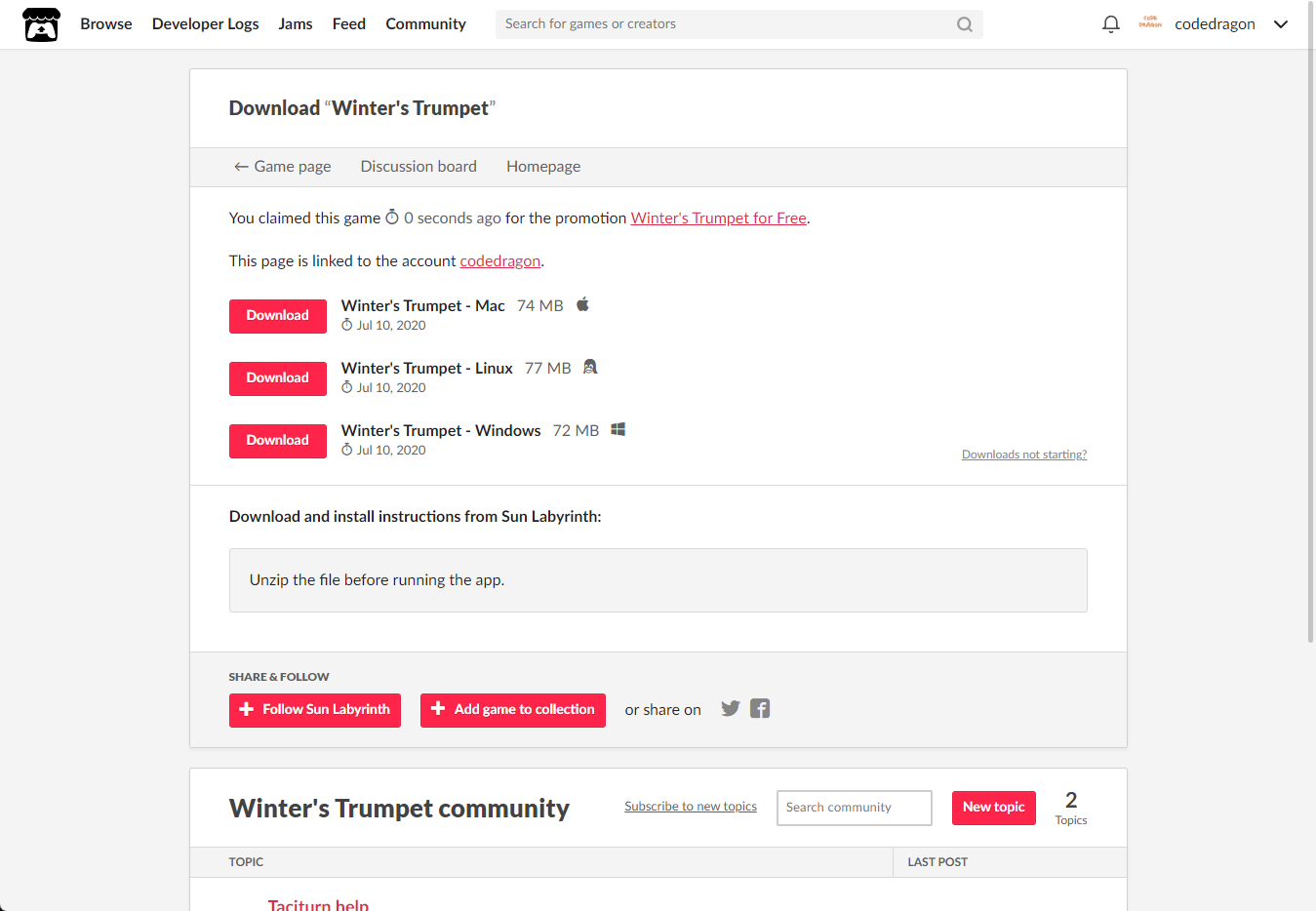 "Winter's Trumpet" 페이지에 있는 [Download or claim]을 클릭합니다.