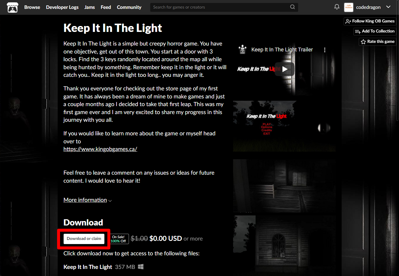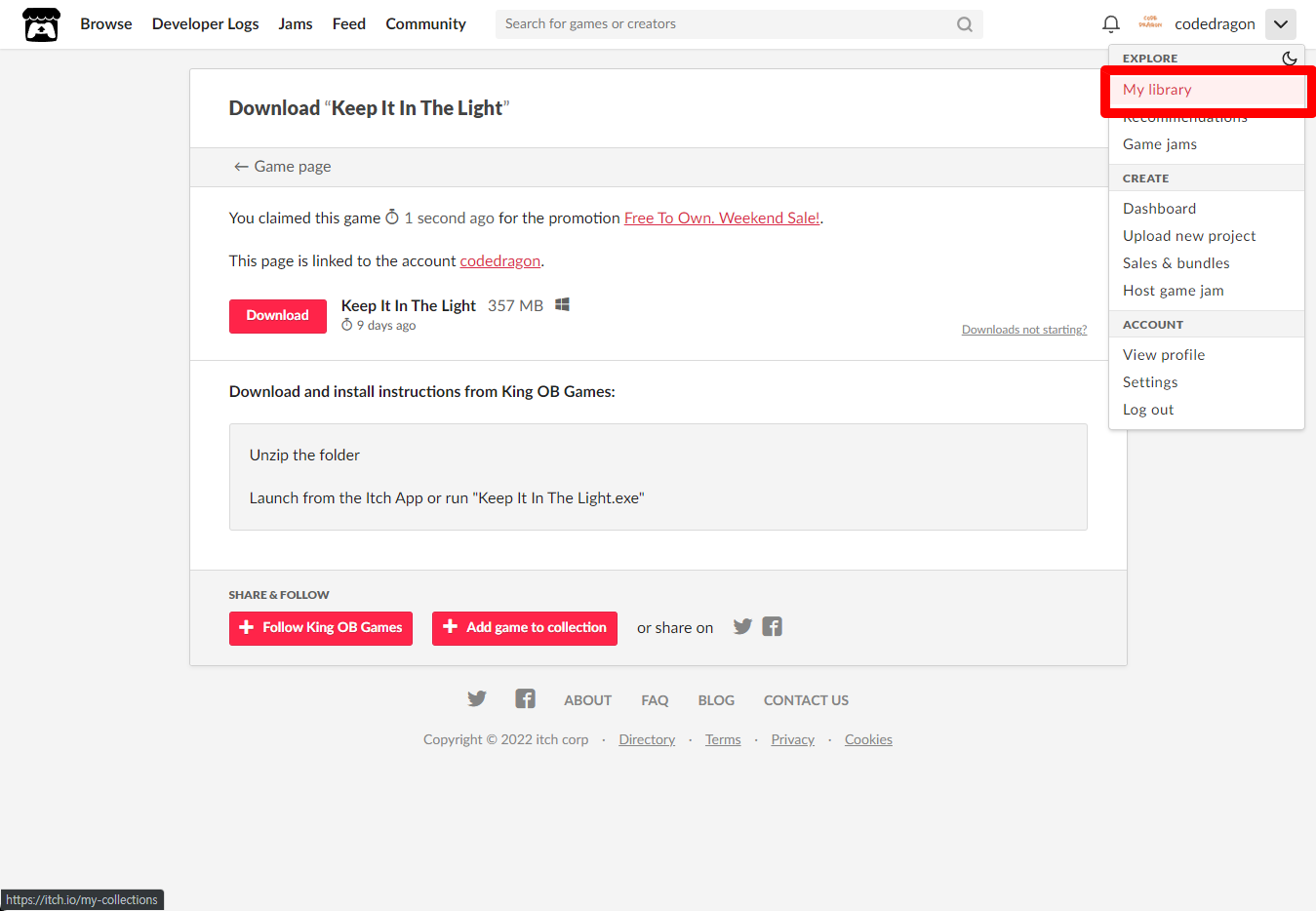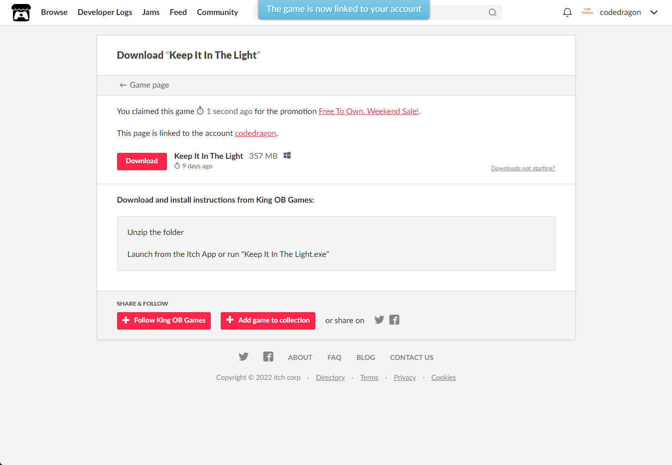 [Claim game]을 클릭하면 "Keep It In The Light" 게임이 나의 게임 라이브러리에 추가되고 설치파일을 다운받을 수 있는 페이지로 이동됩니다.