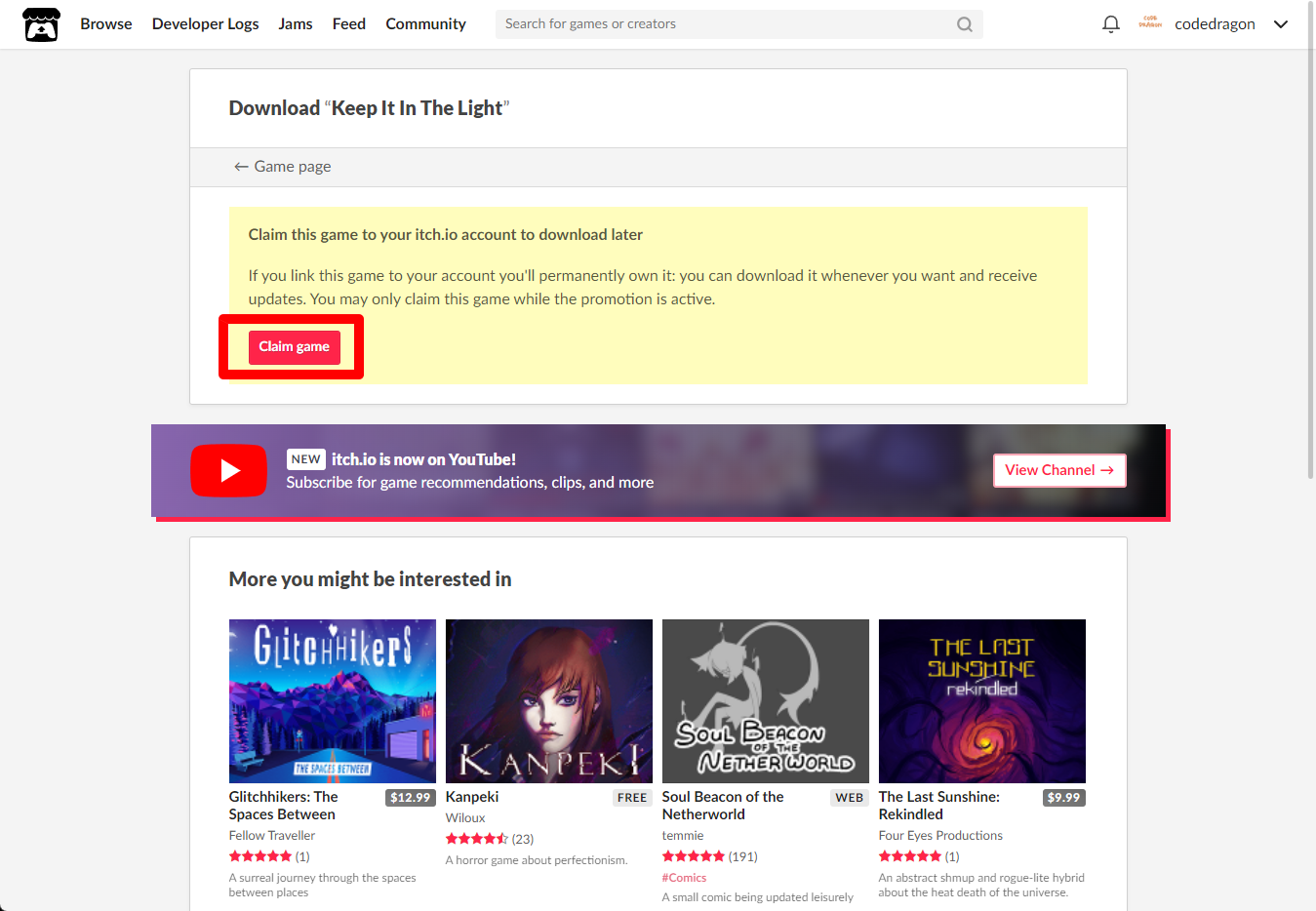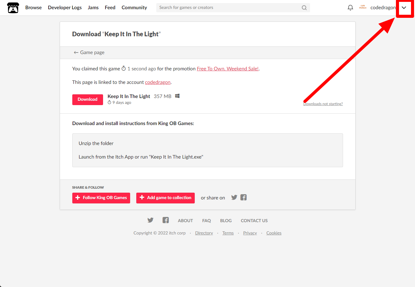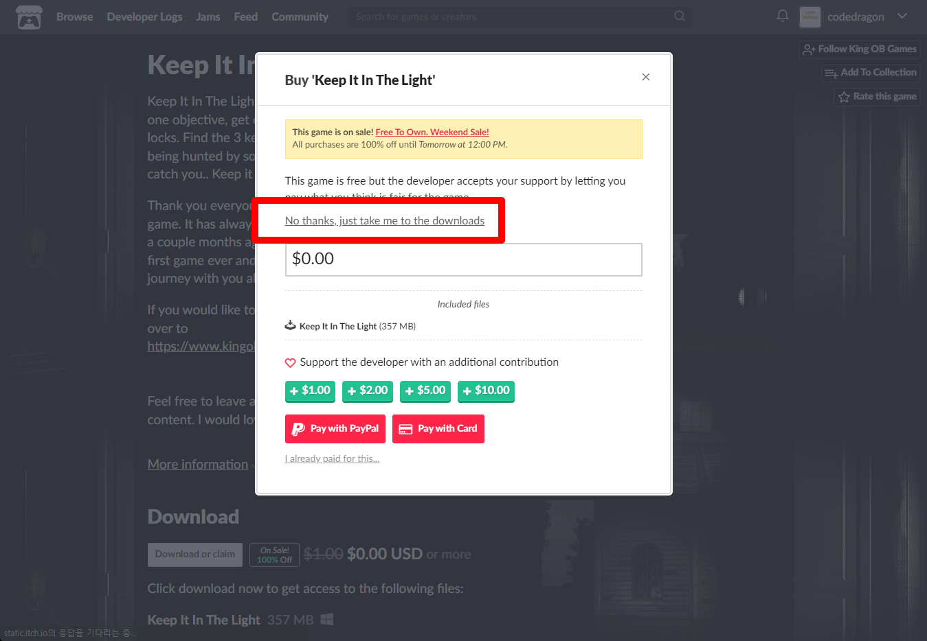 [Claim game]을 클릭하면 "Keep It In The Light" 게임이 나의 게임 라이브러리에 추가되고 설치파일을 다운받을 수 있는 페이지로 이동됩니다.
