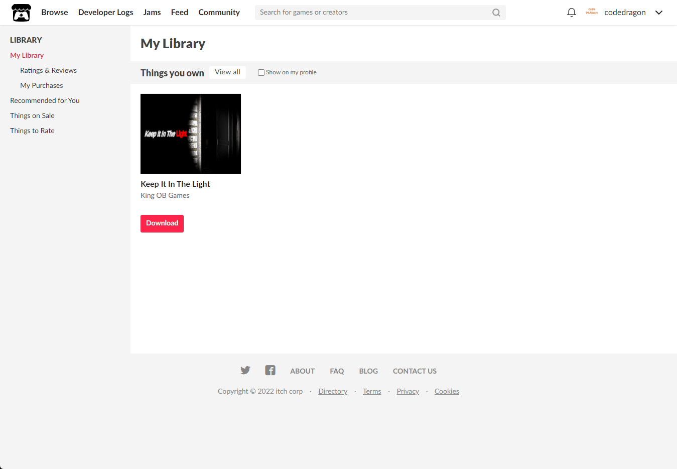 "My Lirary"에서 방금 받은 "Keep It In The Light" 게임 항목을 확인할 수 있습니다.