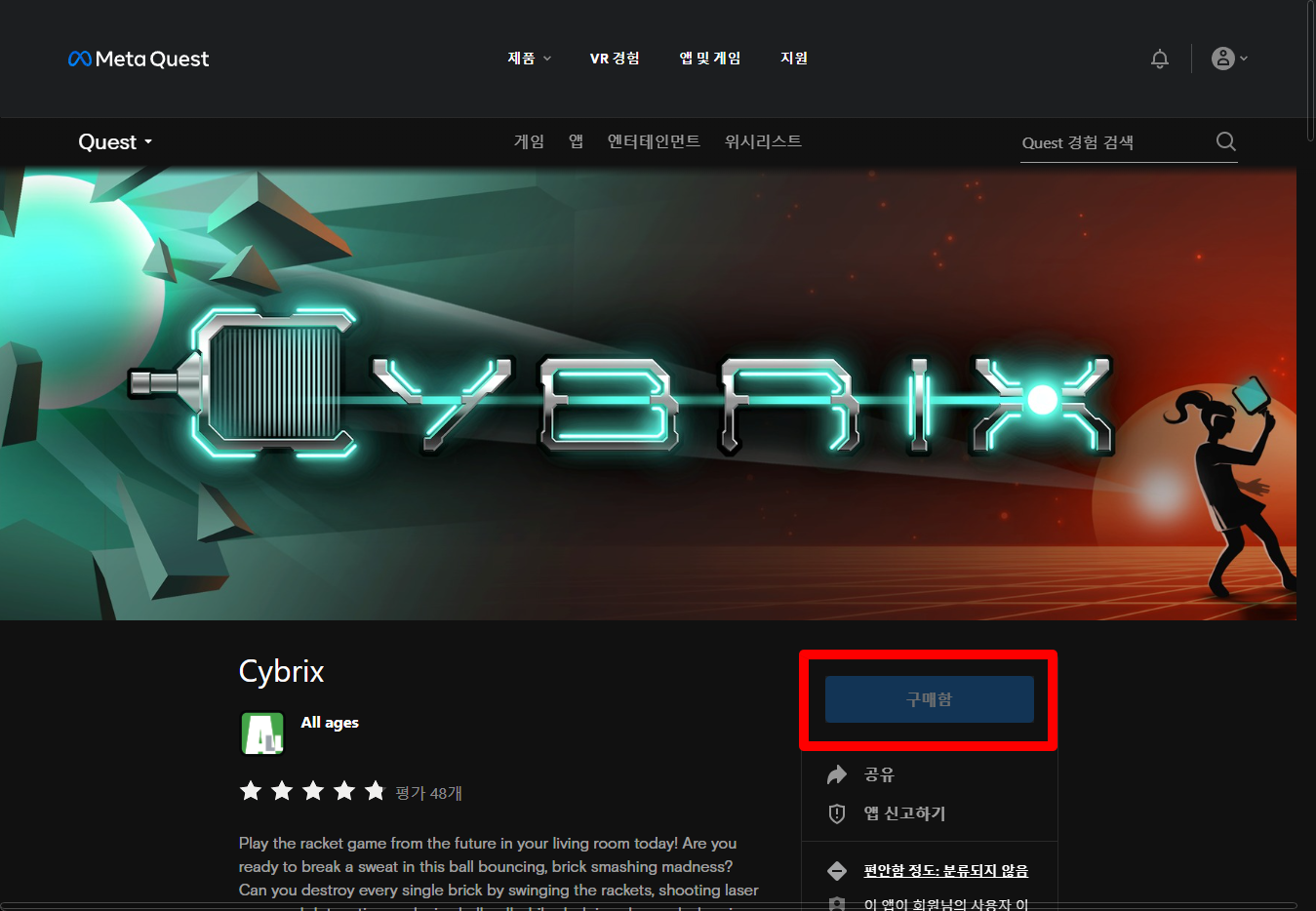 "Cybrix" 게임 페이지를 보면 "구매함"으로 표시되어 있어 가지고 있는 것 확인할 수 있습니다.