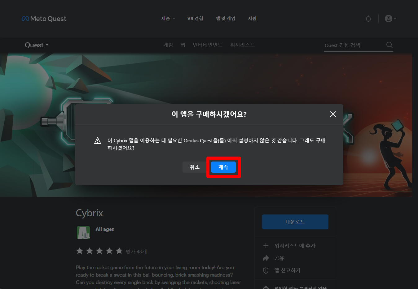 "Cybrix" 구매확인창이 나오면 [계속] 클릭합니다.