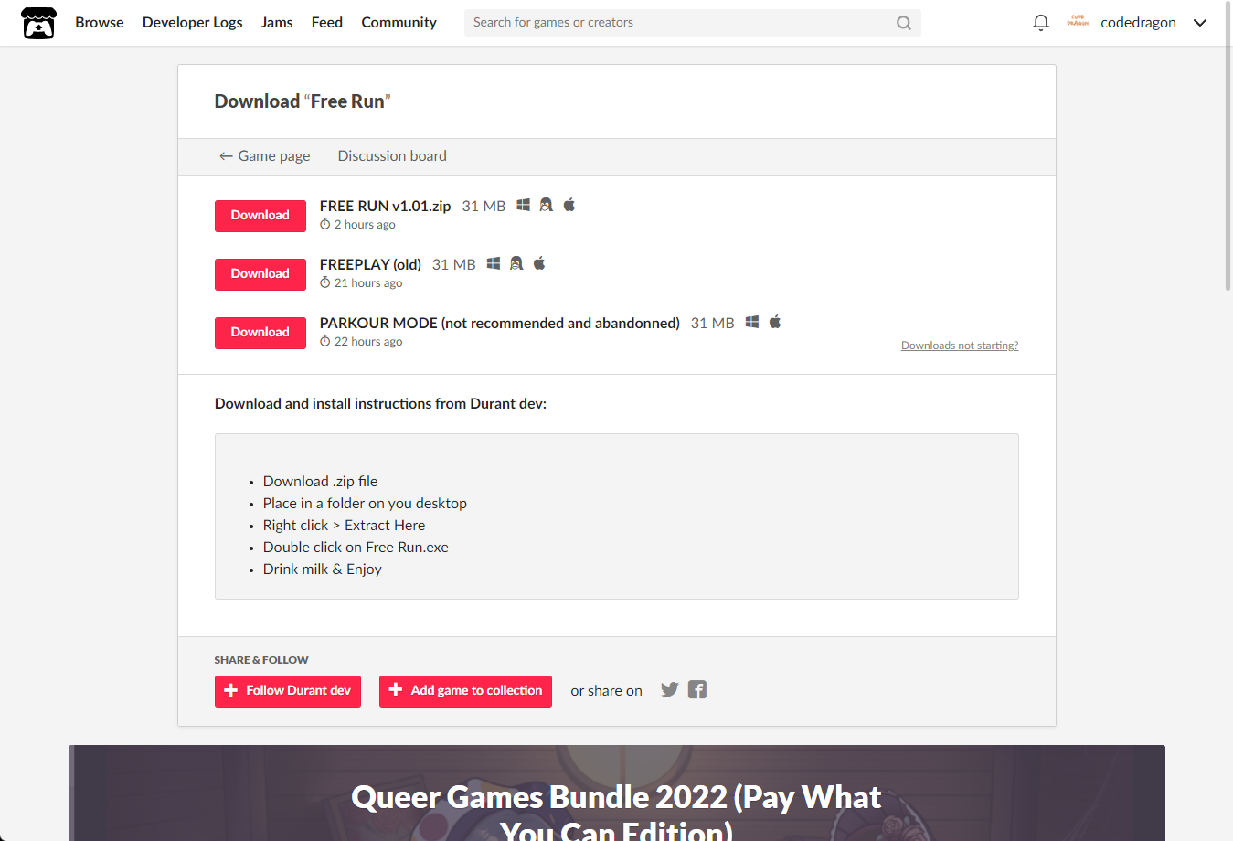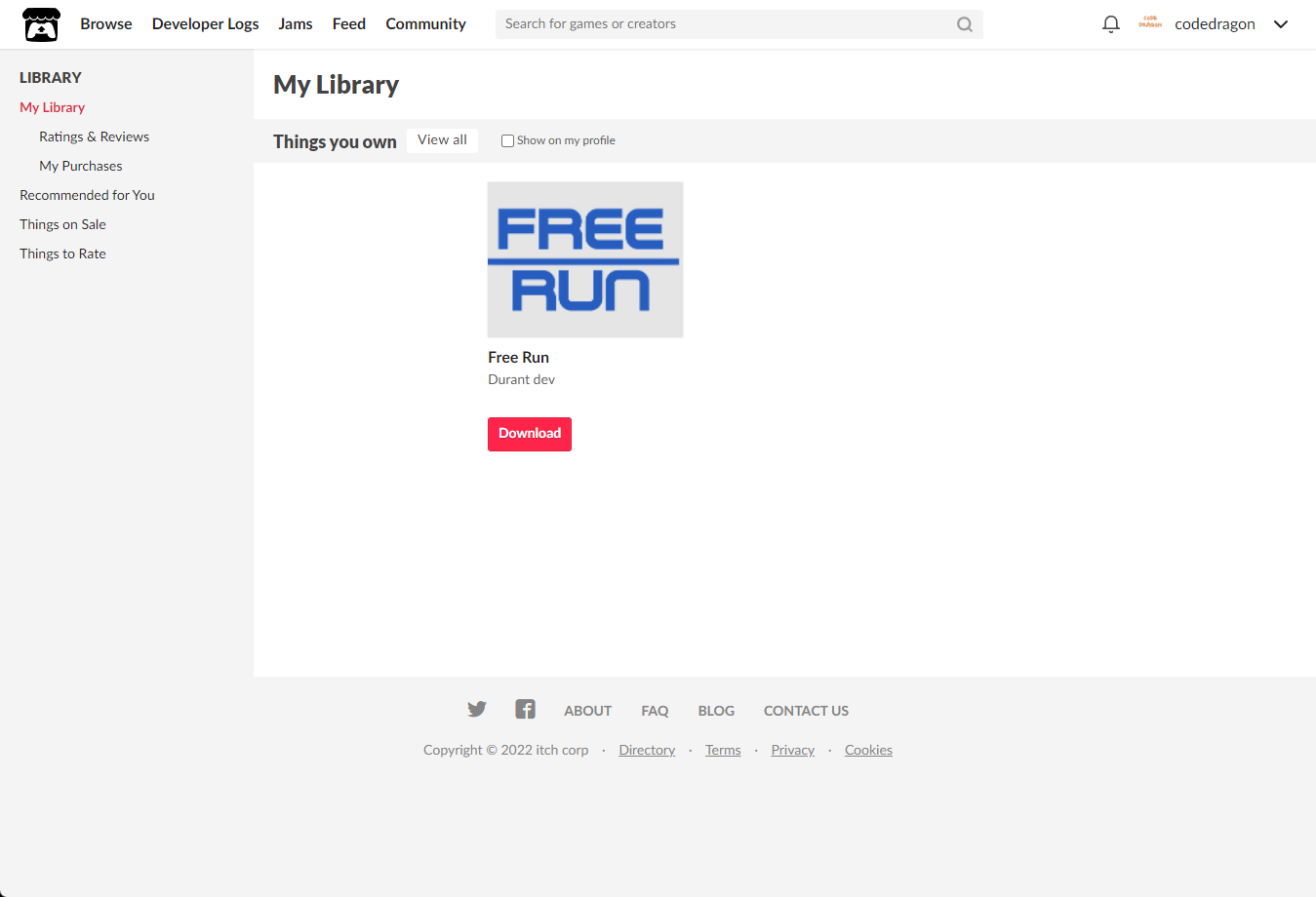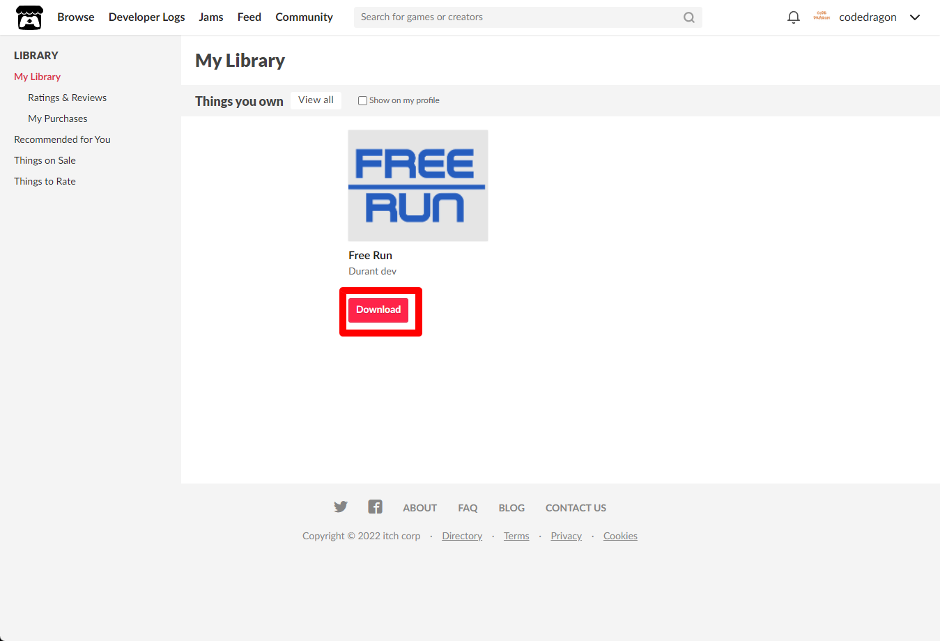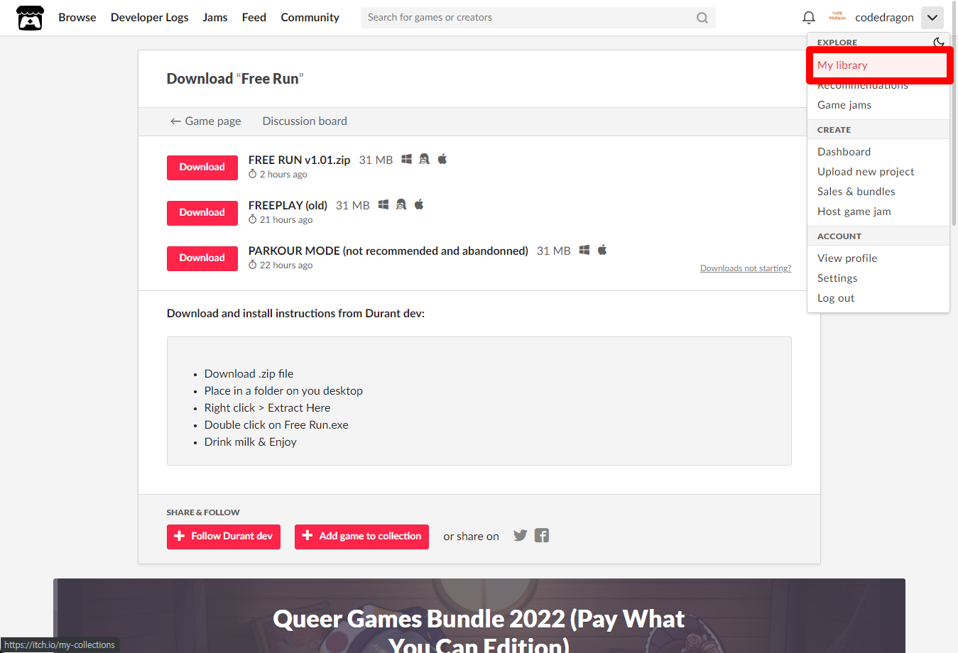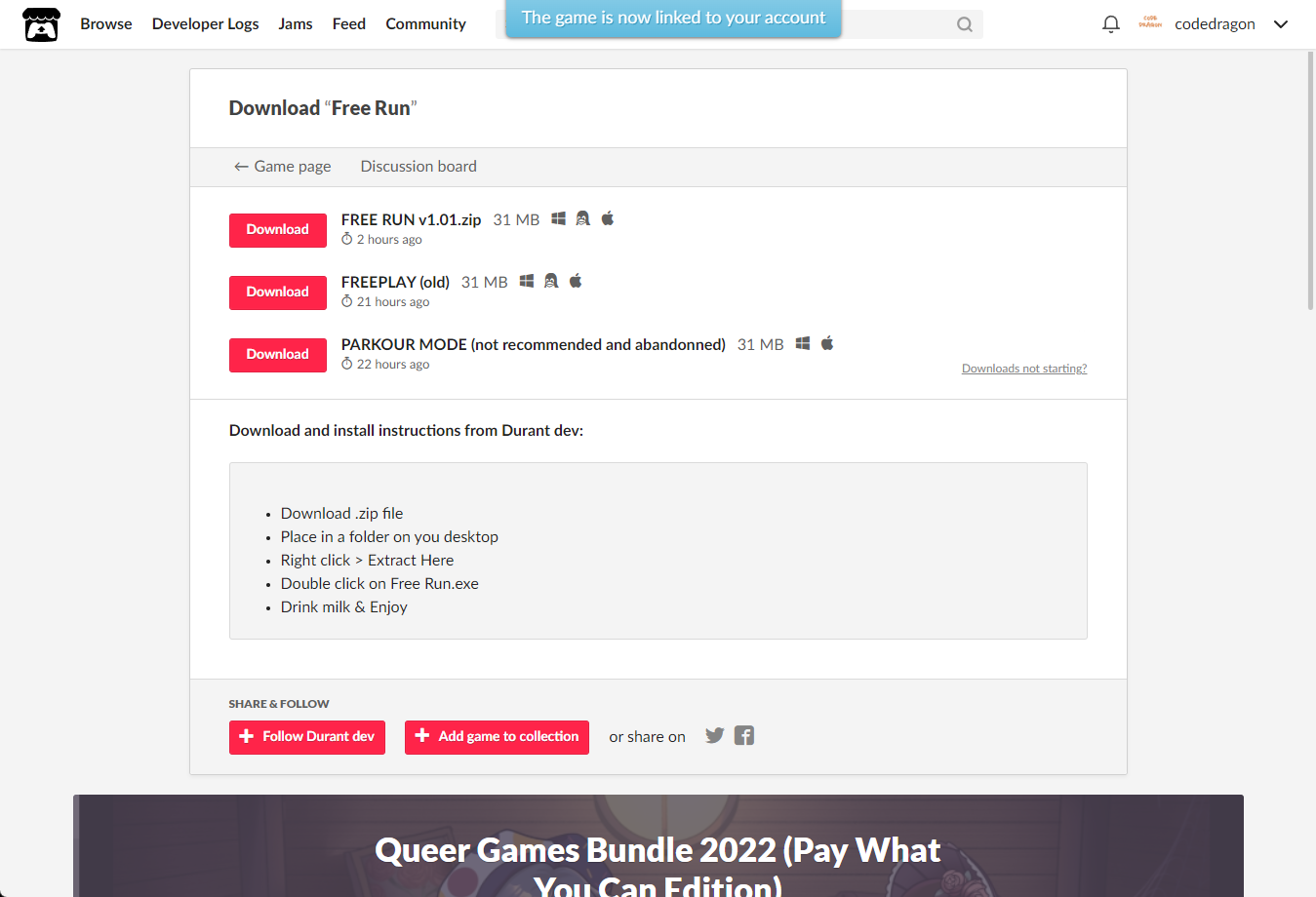 [Claim game]을 클릭하면 "Free Run" 게임이 나의 게임 라이브러리에 추가되고 설치파일을 다운받을 수 있는 페이지로 이동됩니다.