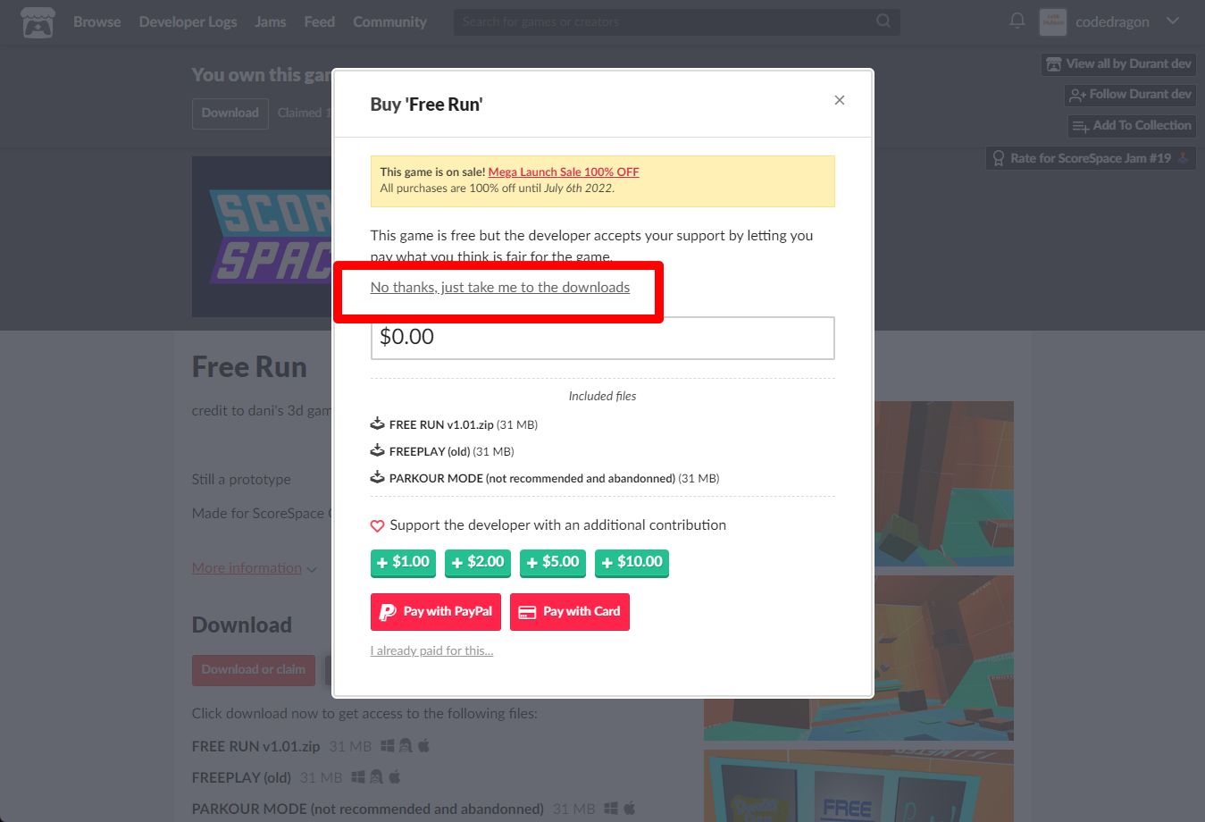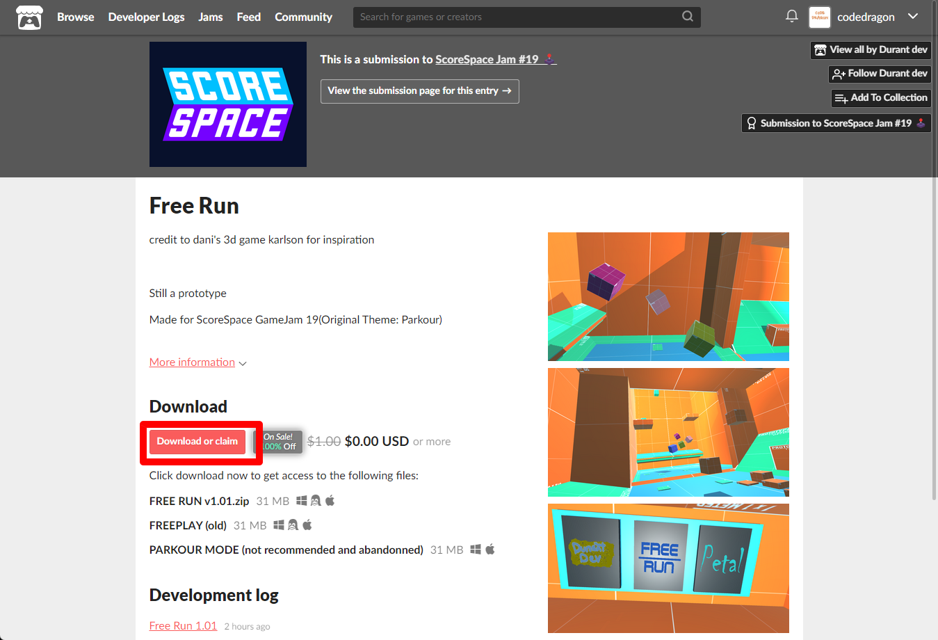 "Free Run" 페이지에 있는 [Download or claim]을 클릭합니다.