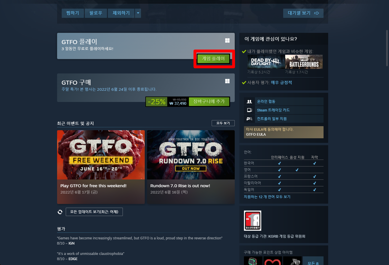 "GTFO" 게임페이지를 조금 내려서 [게임 플레이] 버튼을 클릭하면 됩니다.