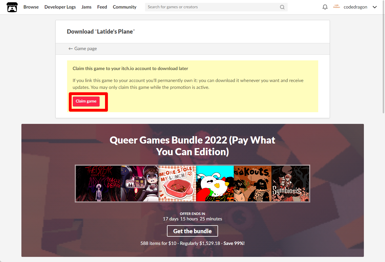 [Claim game]을 클릭하면 "Latide's Plane" 게임이 나의 게임 라이브러리에 추가되고 설치파일을 다운받을 수 있는 페이지로 이동됩니다.
