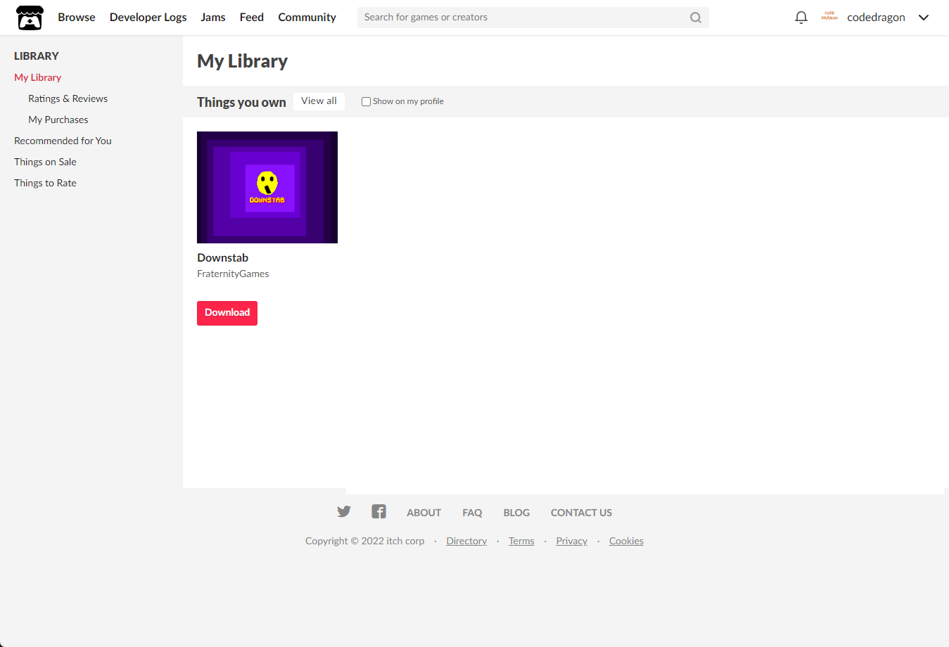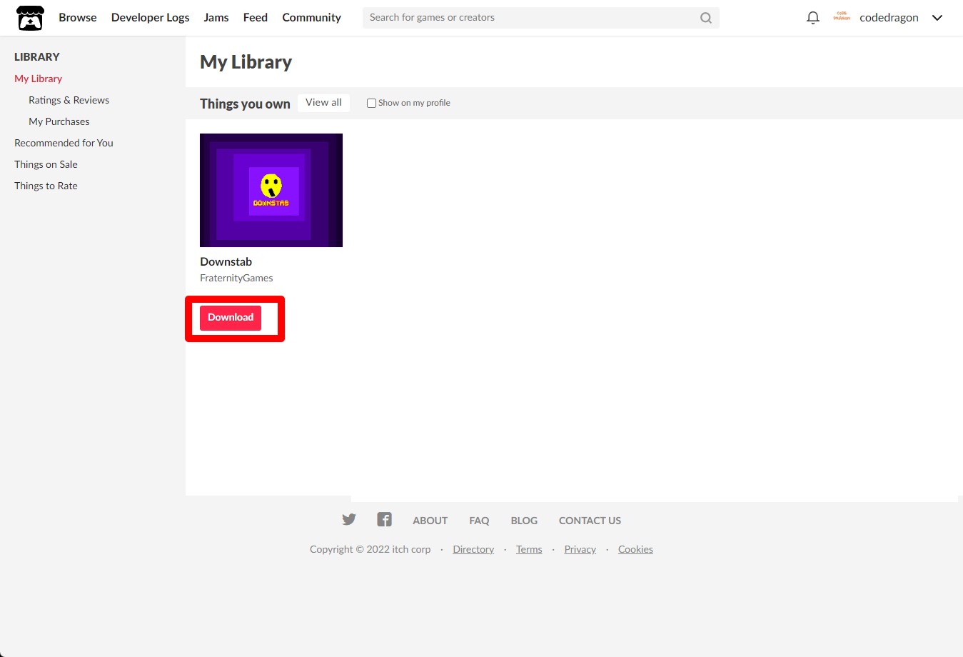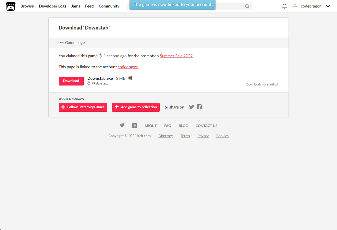 [Claim game]을 클릭하면 "Downstab" 게임이 나의 게임 라이브러리에 추가되고 설치파일을 다운받을 수 있는 페이지로 이동됩니다.