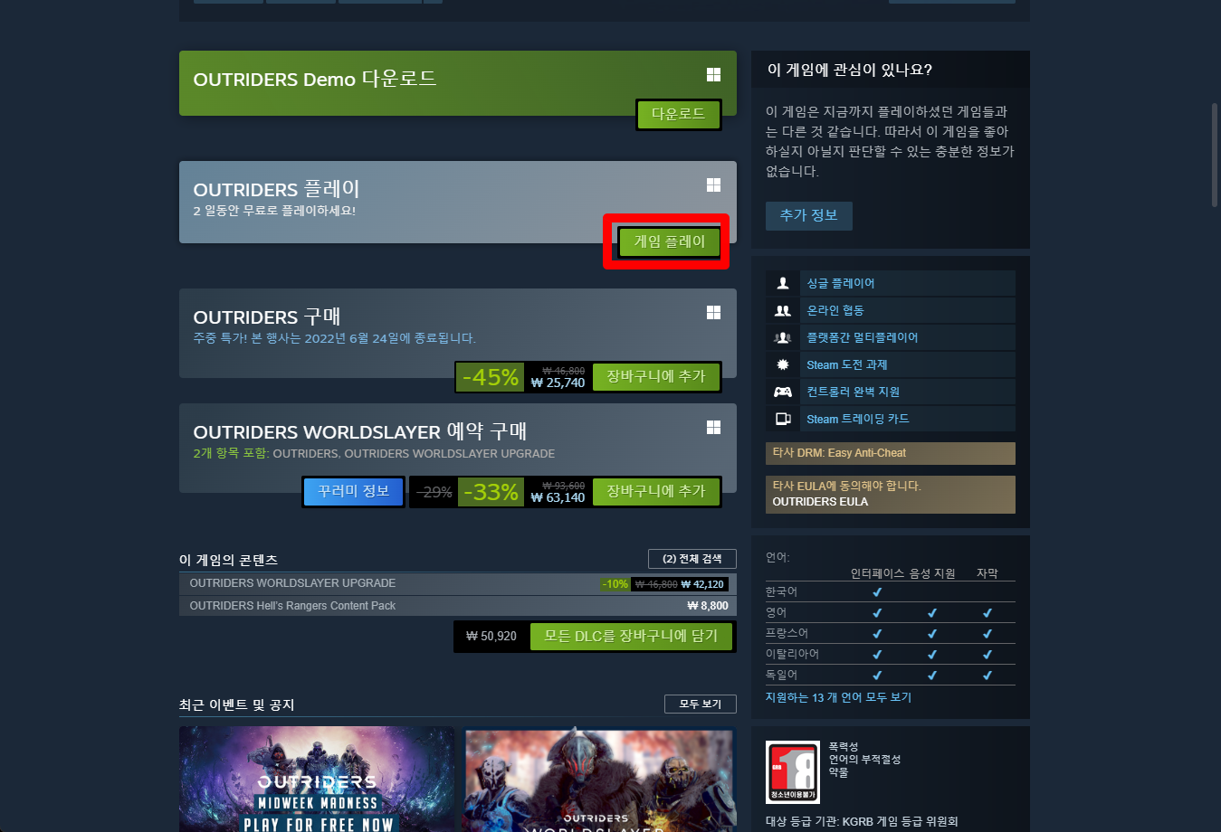 "OUTRIDERS" 게임페이지를 조금 내려서 [게임 플레이] 버튼을 클릭하면 됩니다.