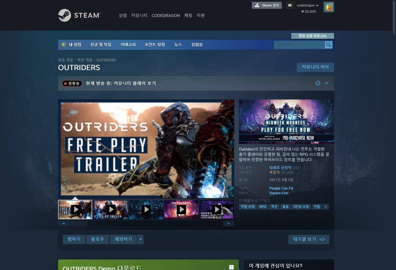 "OUTRIDERS" 게임페이지에 접속합니다.
