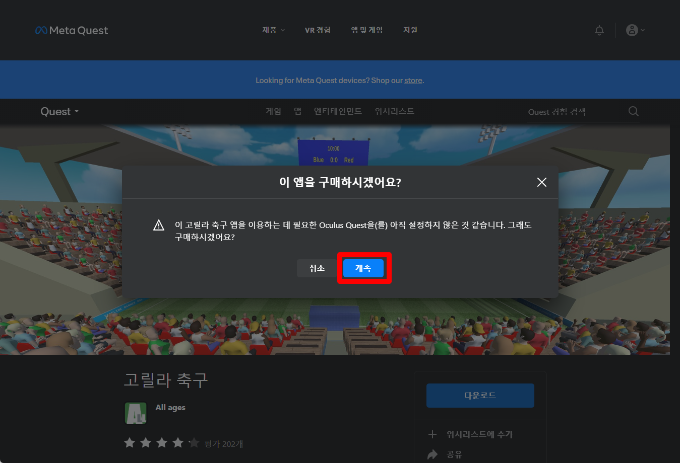 "고릴라 축구" 구매확인창이 나오면 [계속] 클릭합니다.
