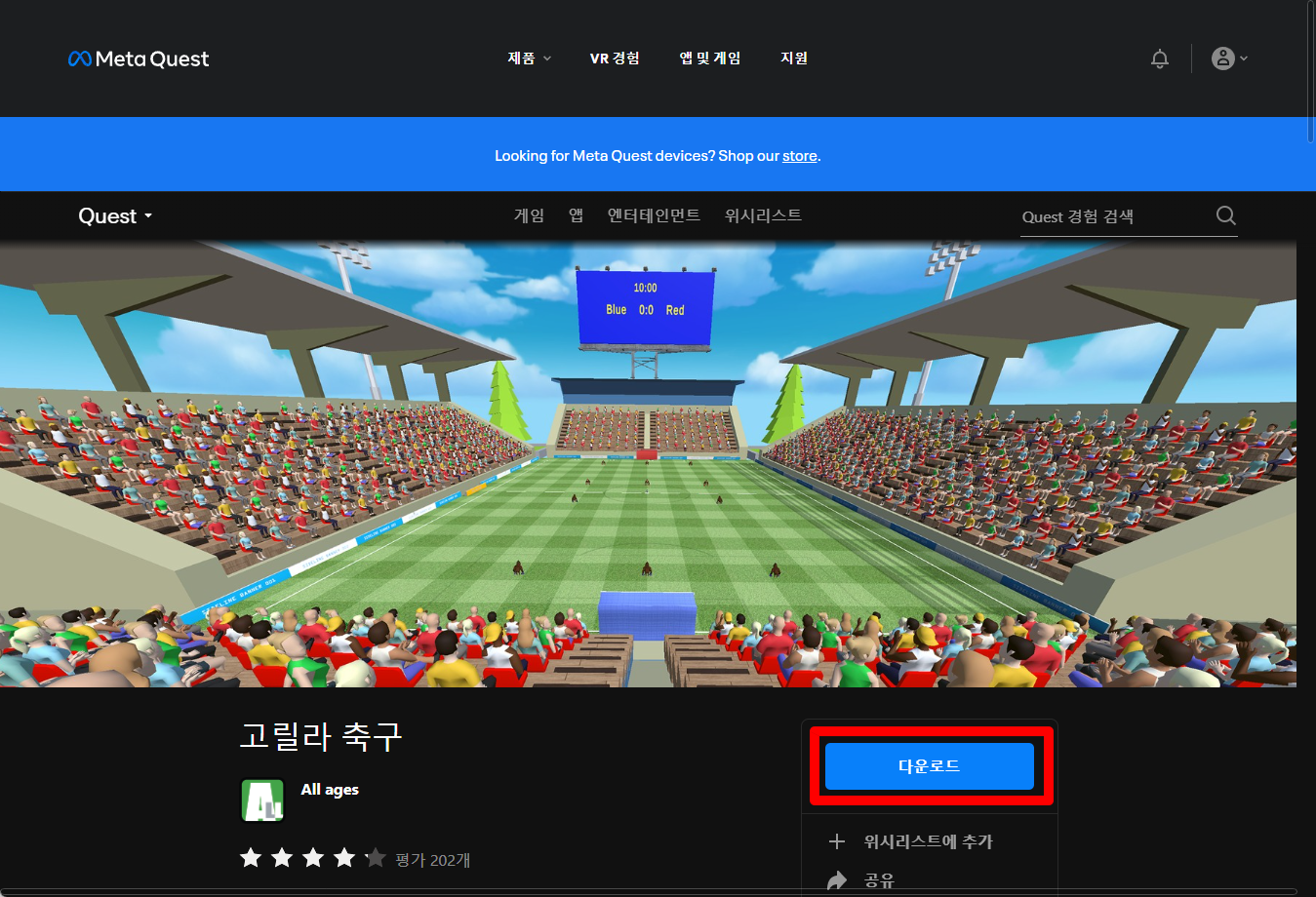 "고릴라 축구" 게임페이지에 있는 [다운로드] 버튼 클릭합니다.