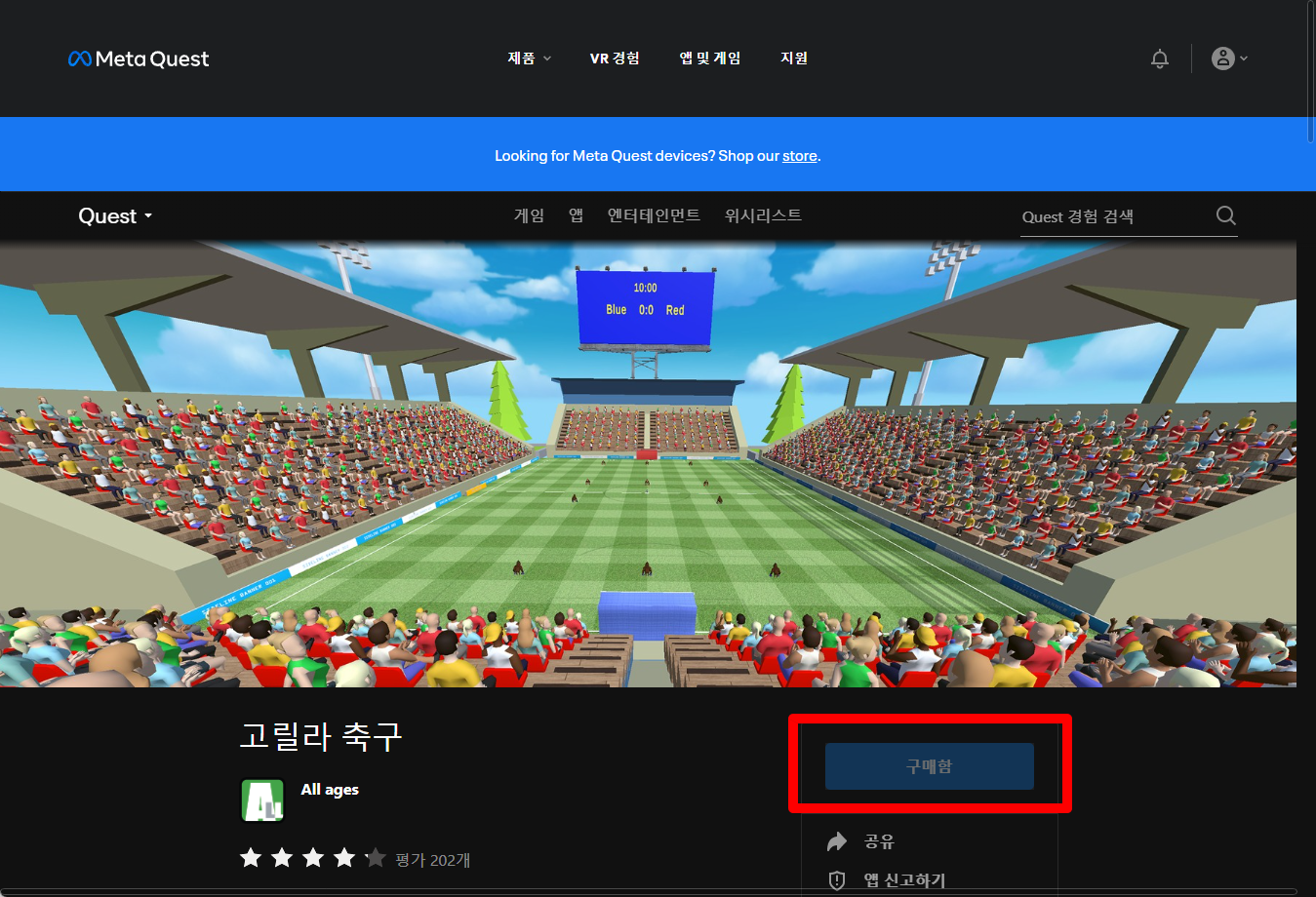 "고릴라 축구" 게임 페이지를 보면 "구매함"으로 표시되어 있어 가지고 있는 것 확인할 수 있습니다.