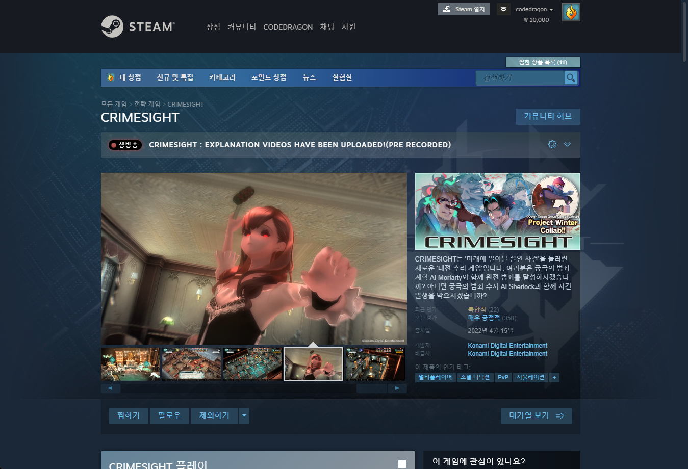 금주 게임은 "추리" 게임인 "CRIMESIGHT" 입니다.