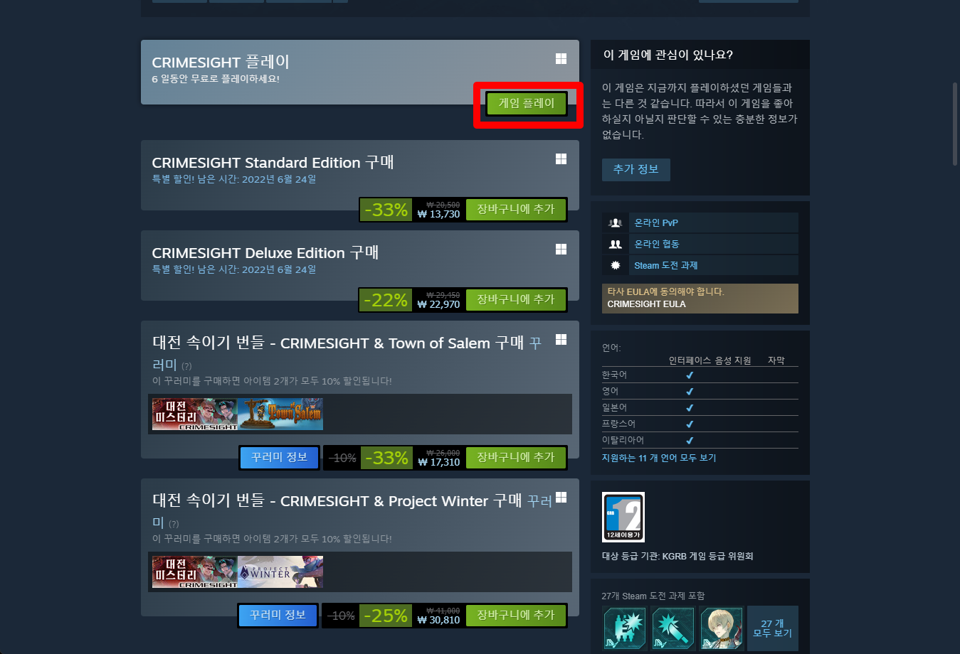 "CRIMESIGHT" 게임페이지를 조금 내려서 [게임 플레이] 버튼을 클릭하면 됩니다.
