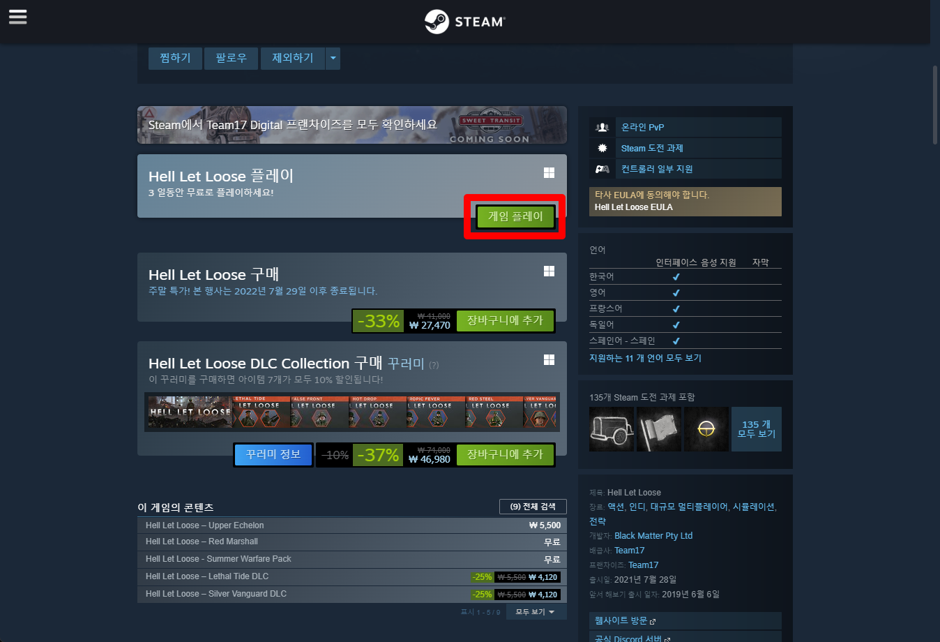 "Hell Let Loose" 게임페이지를 조금 내려서 [게임 플레이] 버튼을 클릭하면 됩니다.