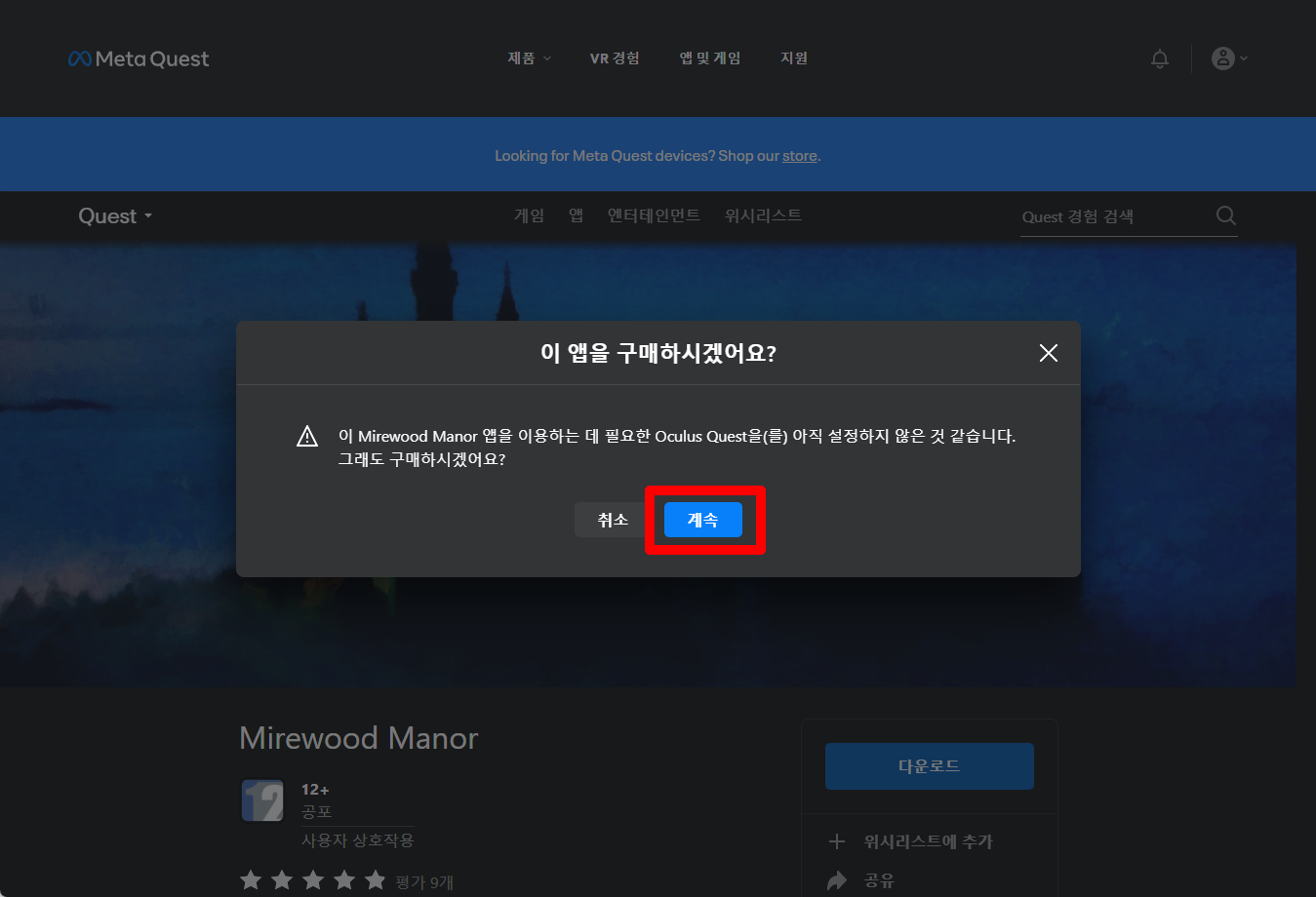 "Mirewood Manor" 구매확인창이 나오면 [계속] 클릭합니다.