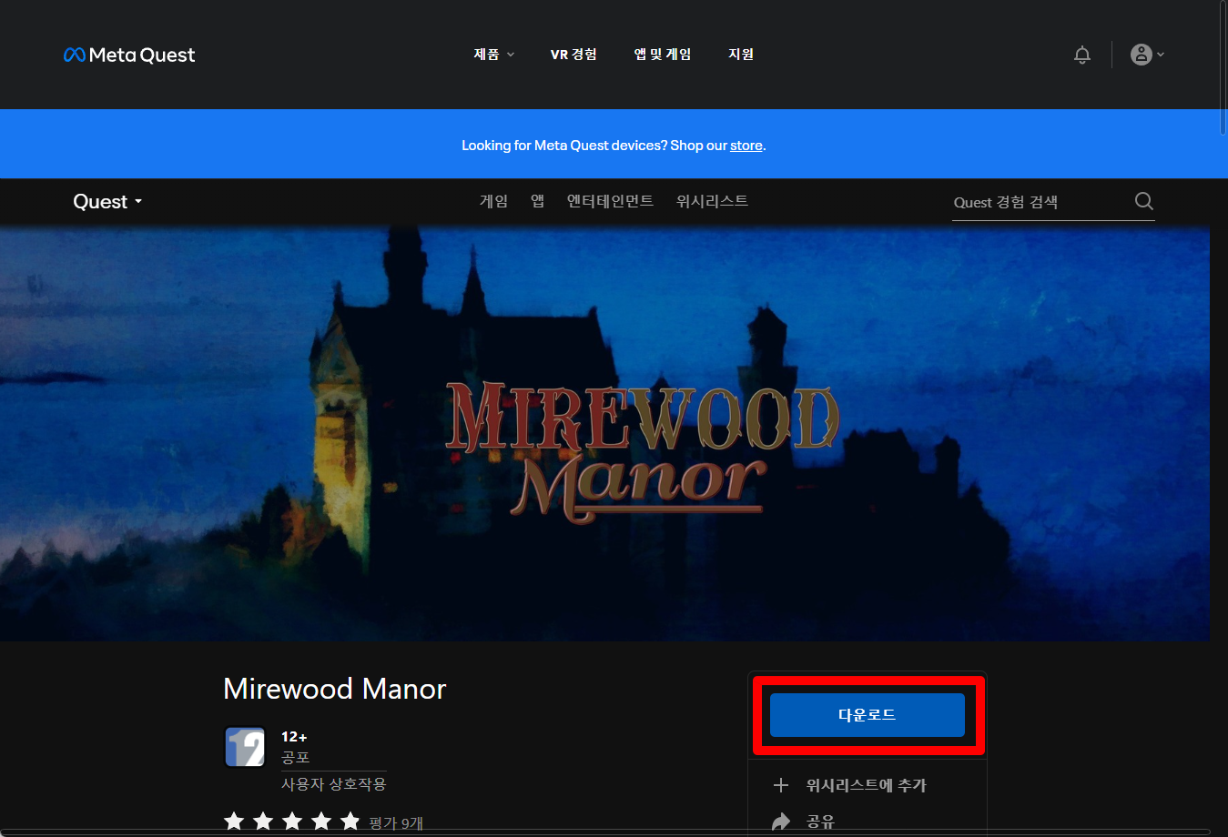 "Mirewood Manor" 게임페이지에 있는 [다운로드] 버튼 클릭합니다.