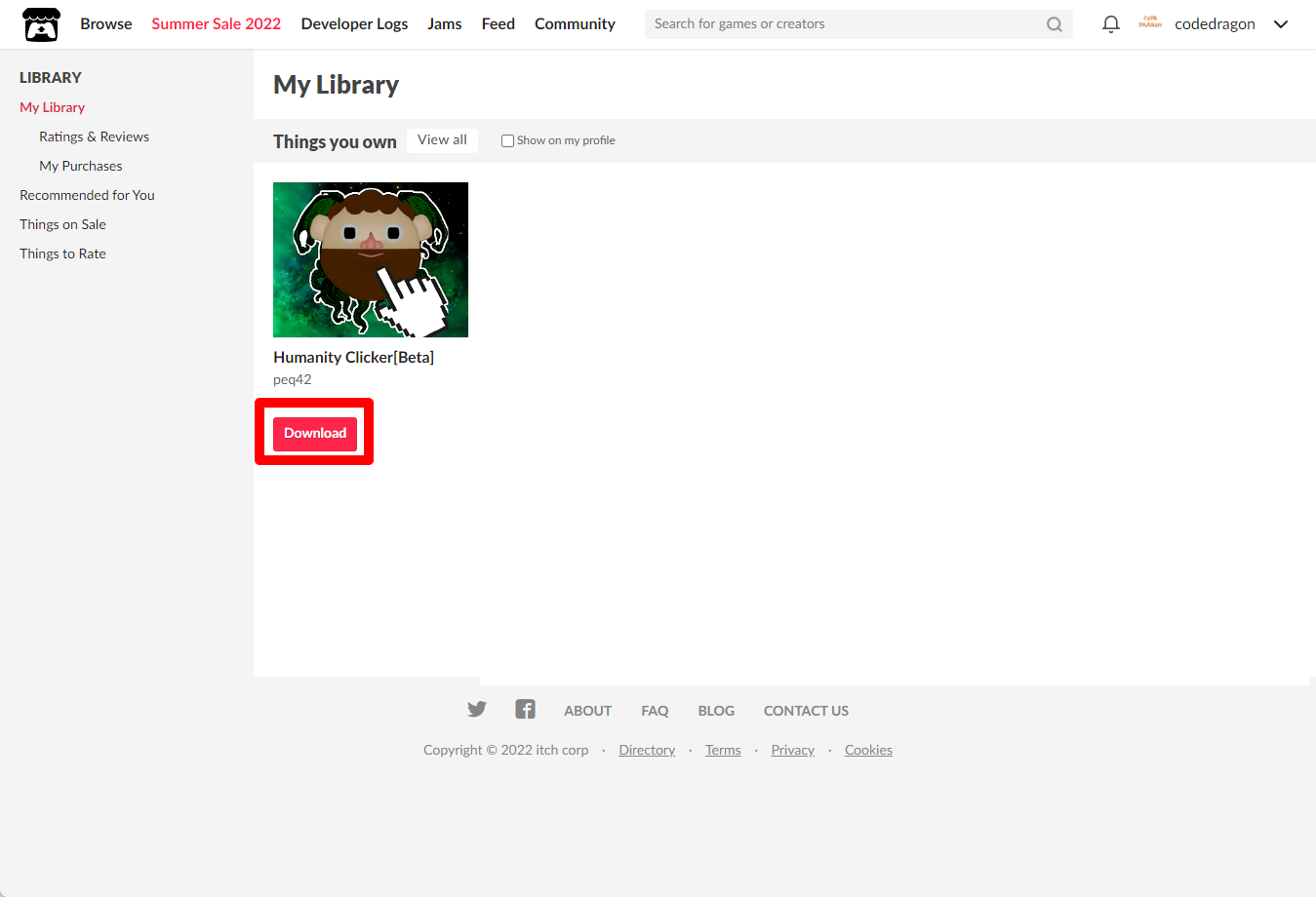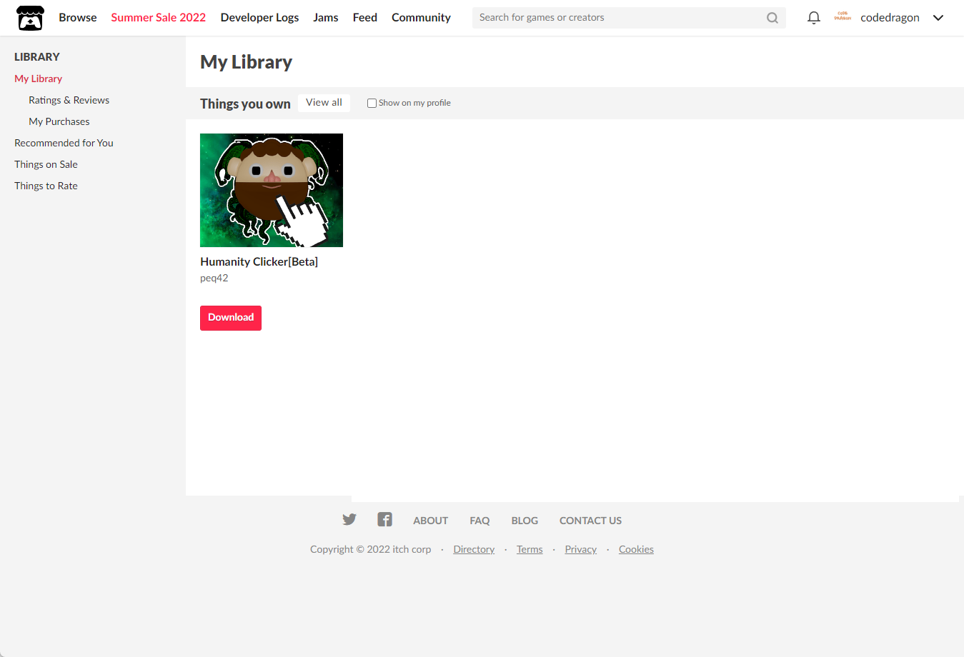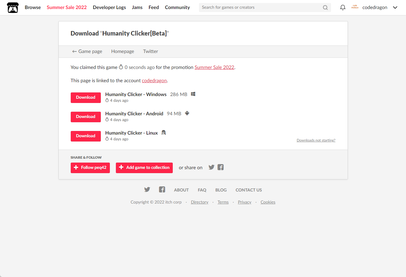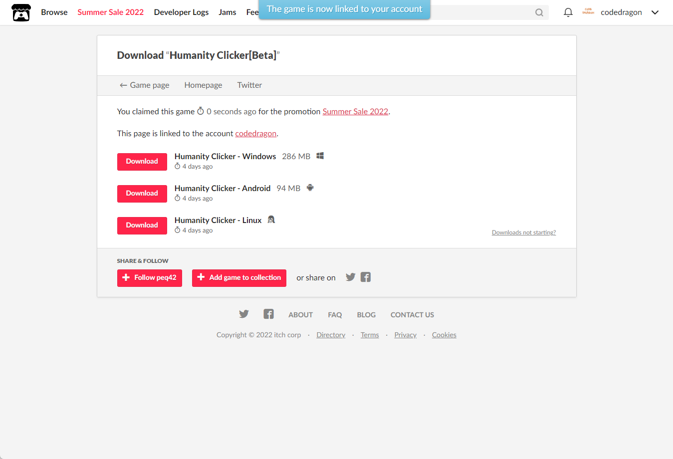 [Claim game]을 클릭하면 "Humanity Clicker[Beta]" 게임이 나의 게임 라이브러리에 추가되고 설치파일을 다운받을 수 있는 페이지로 이동됩니다.